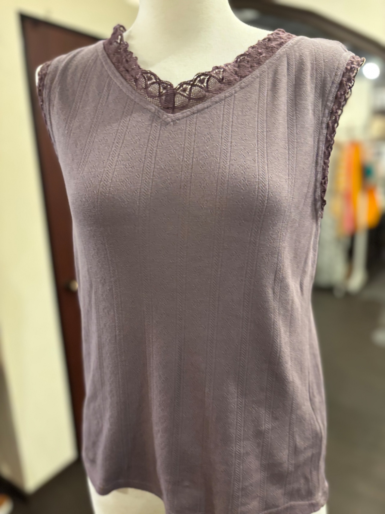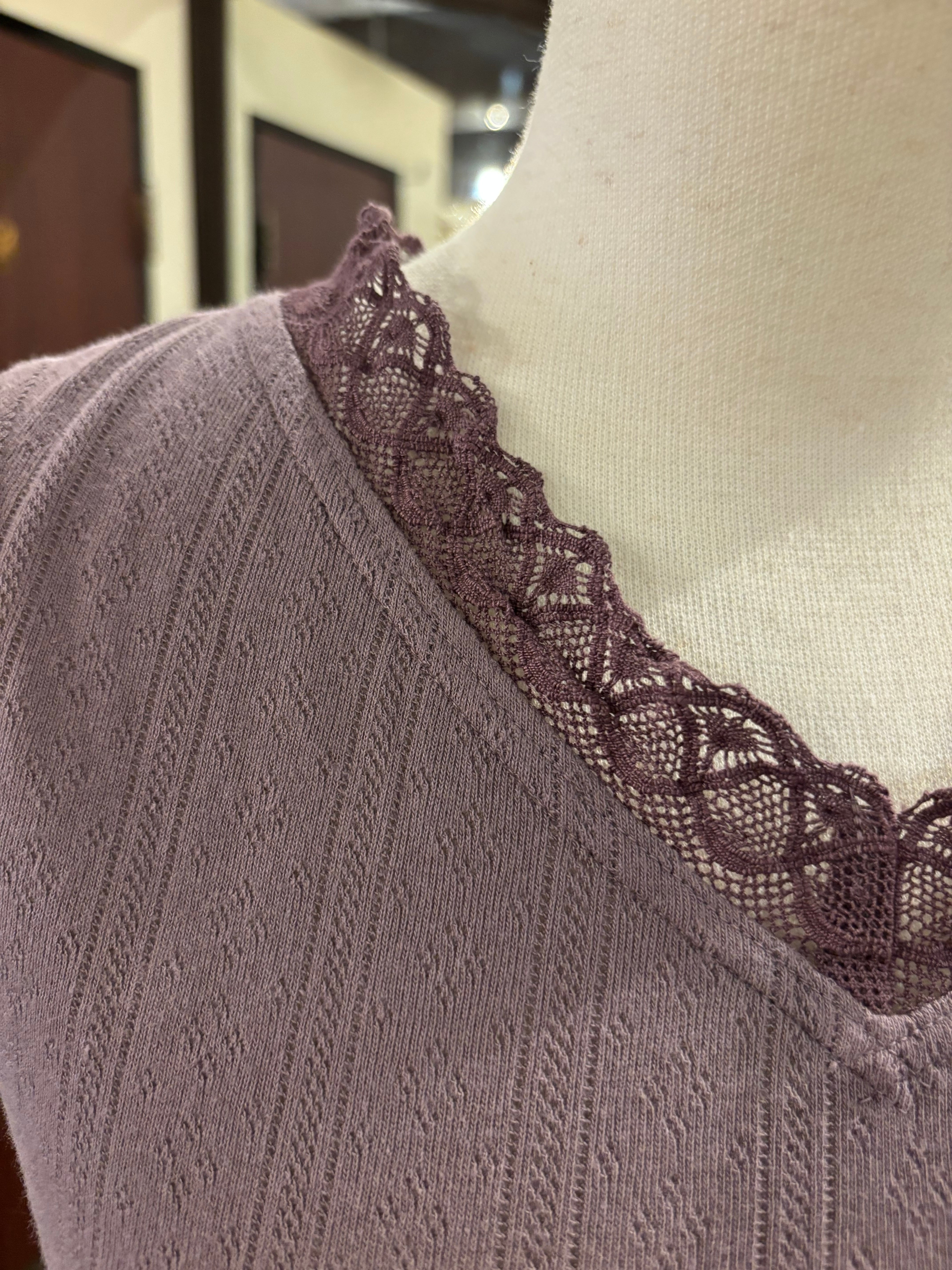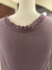 昔ながらのコットンパターンメッシュ。肌触り、吸湿性の良いパターンメッシュを繊細なトーションレース使い(トーションレース機を用いて組紐のように糸で柄を表現する細巾の組レース)にして製品染めにしています。優しい肌触りと染め色の微妙な差で、伸縮性もあり肌に馴染むイメージに仕上がります。Vネックとラウンドどちらも前後両方着用可能です。