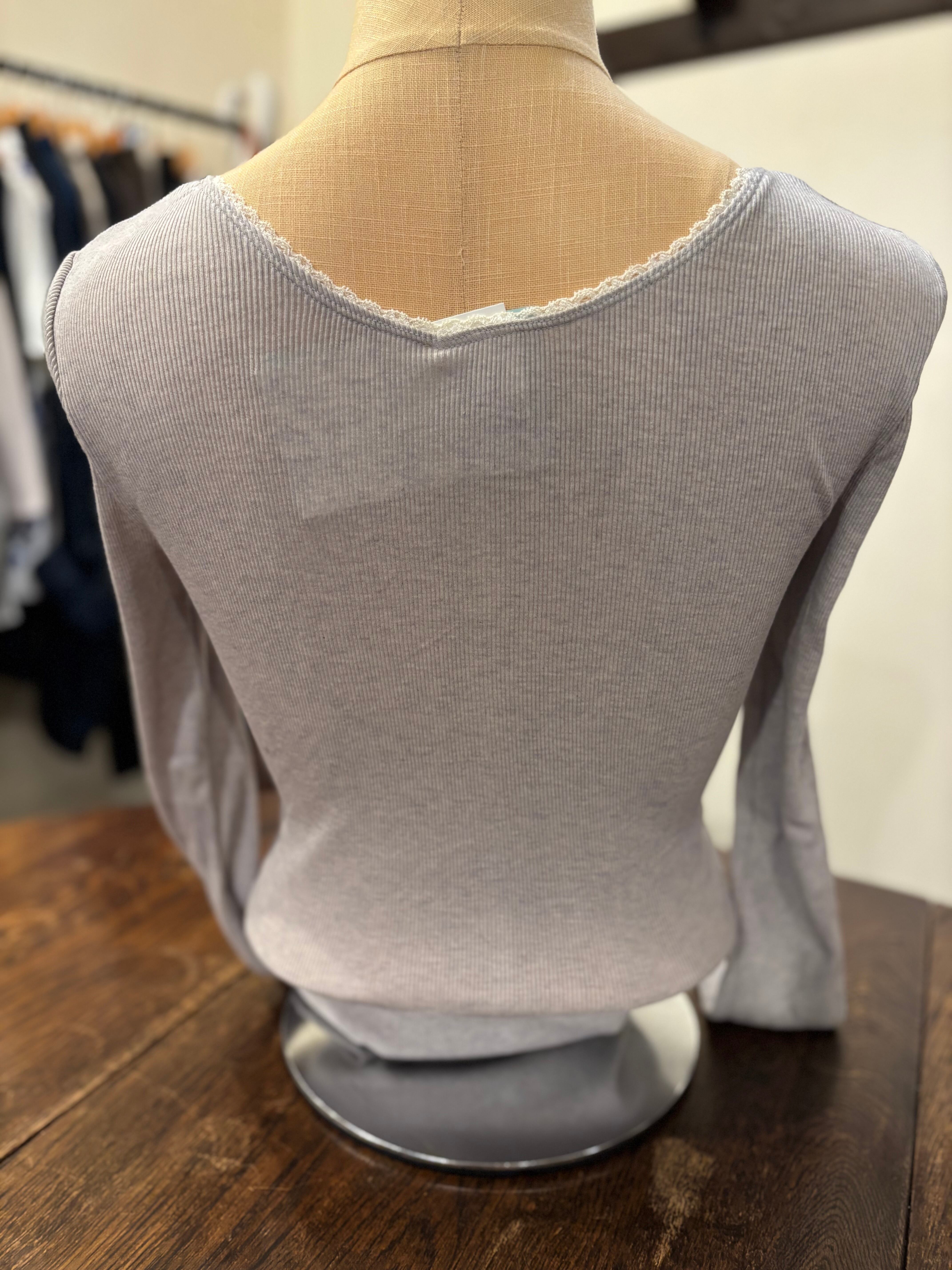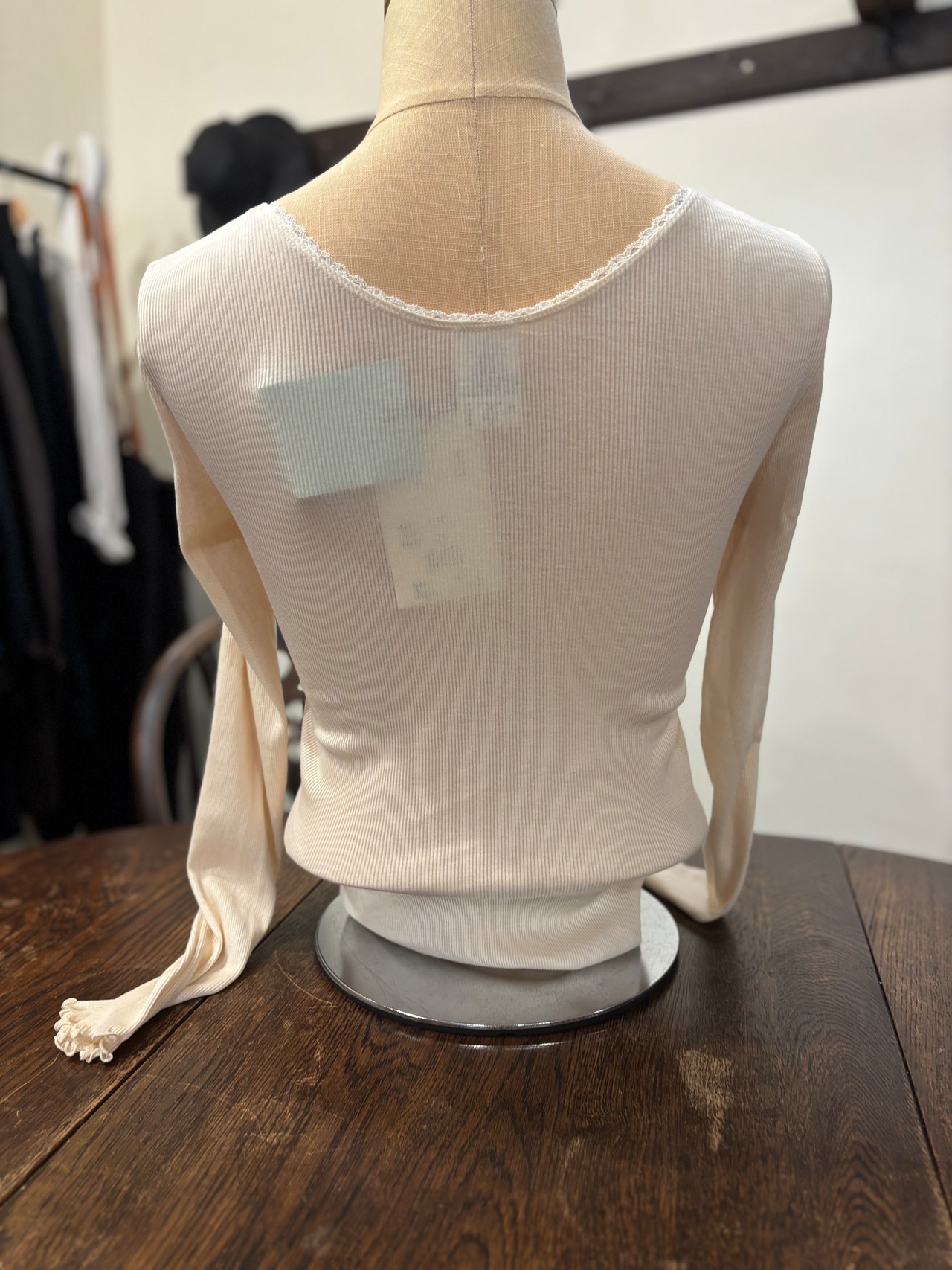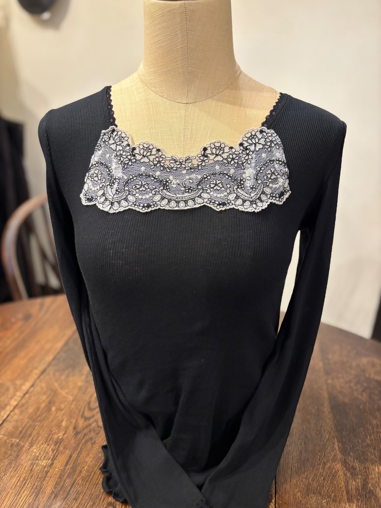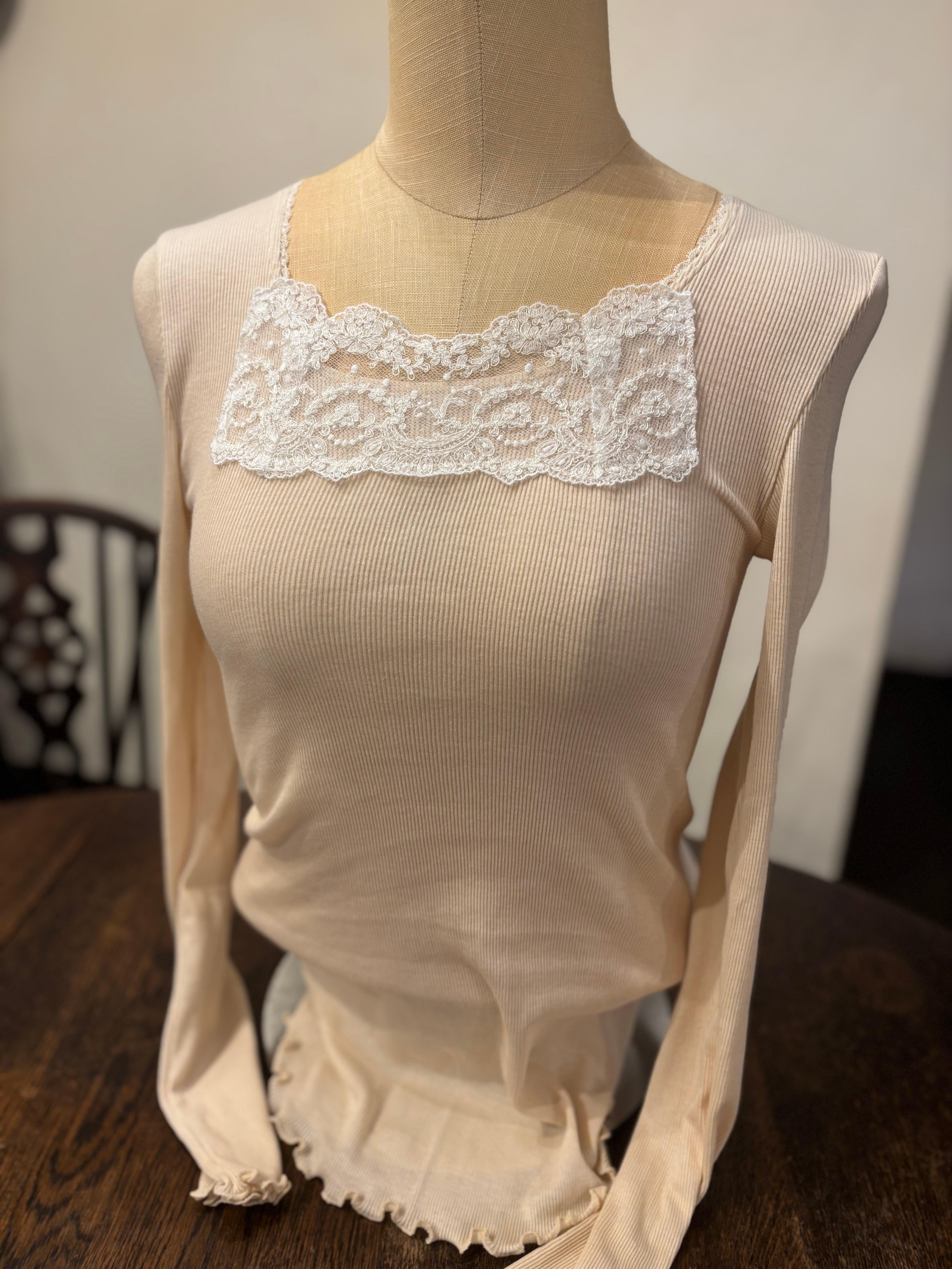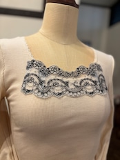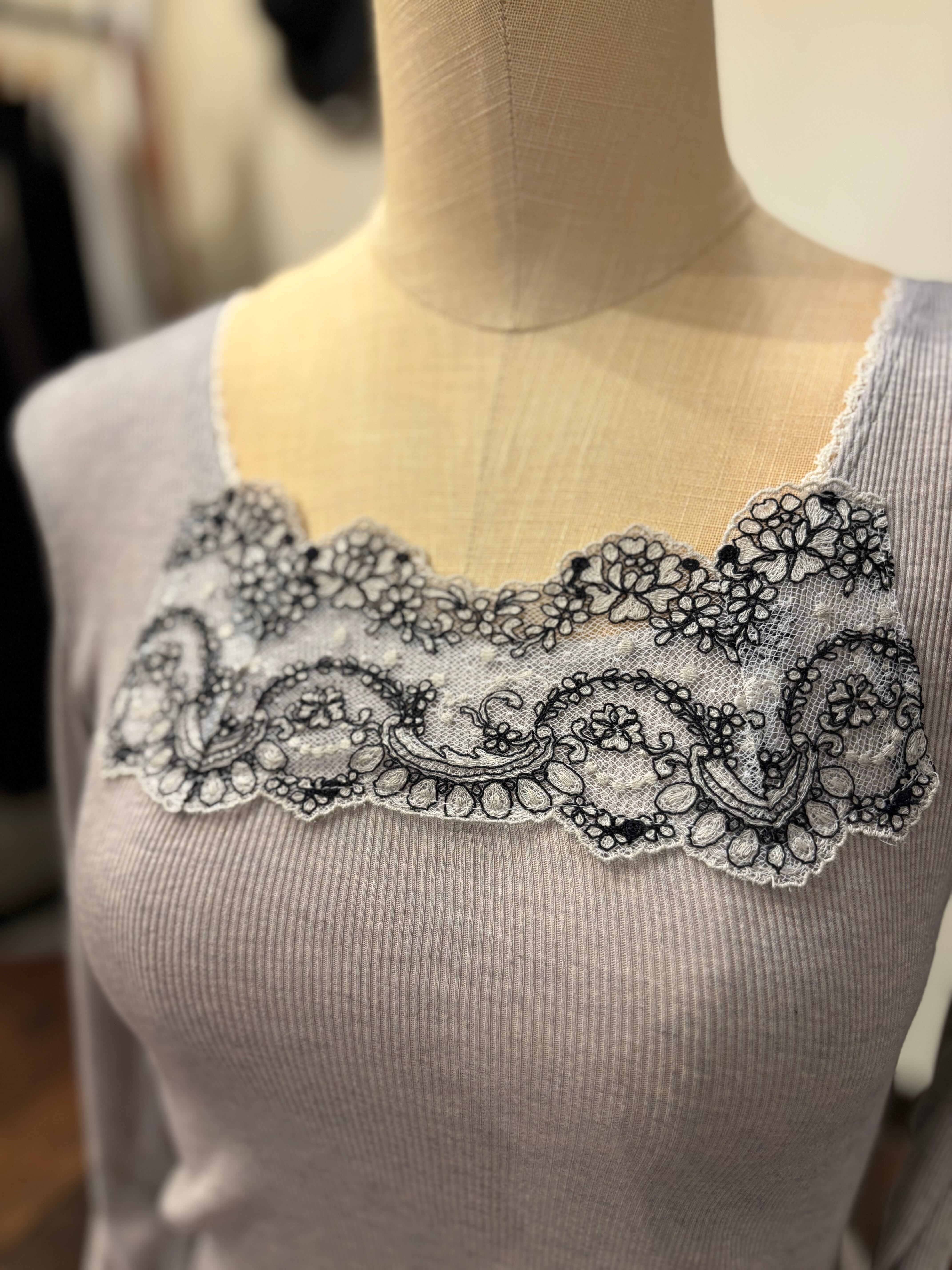 今回こちらの長袖のカシミヤ混コットンシリーズにはフランスのアルベールゲガン社のレースが使用されております。フランスの老舗刺繍工房で作られた、高級感漂うオリジナルのレースを是非ご堪能ください。