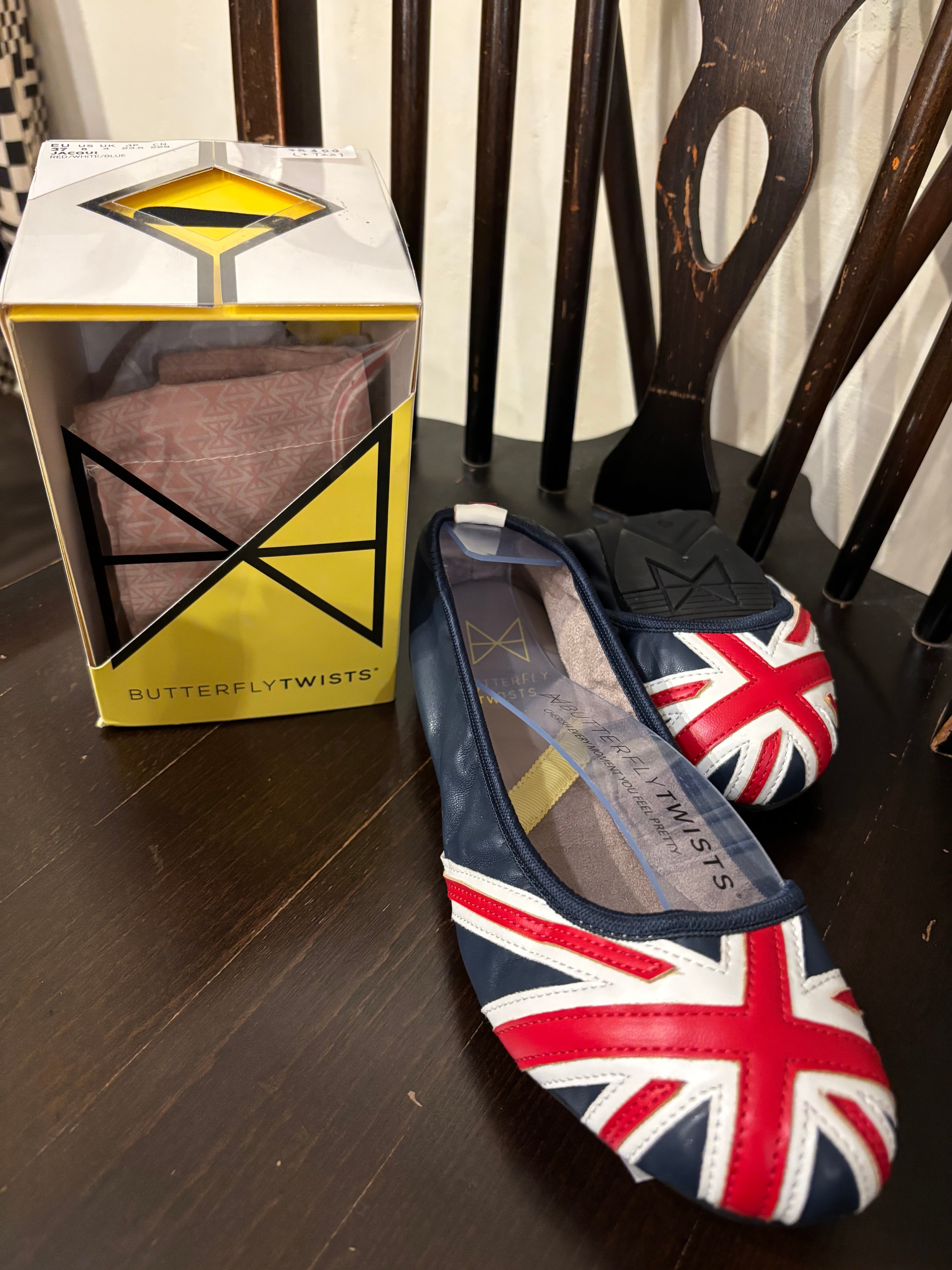 「ジャッキー」は、イギリスのユニオンジャックをデザインした一足で、バタフライツイストの発祥地からのインスピレーションを感じさせます♪とっても軽くて可愛い!