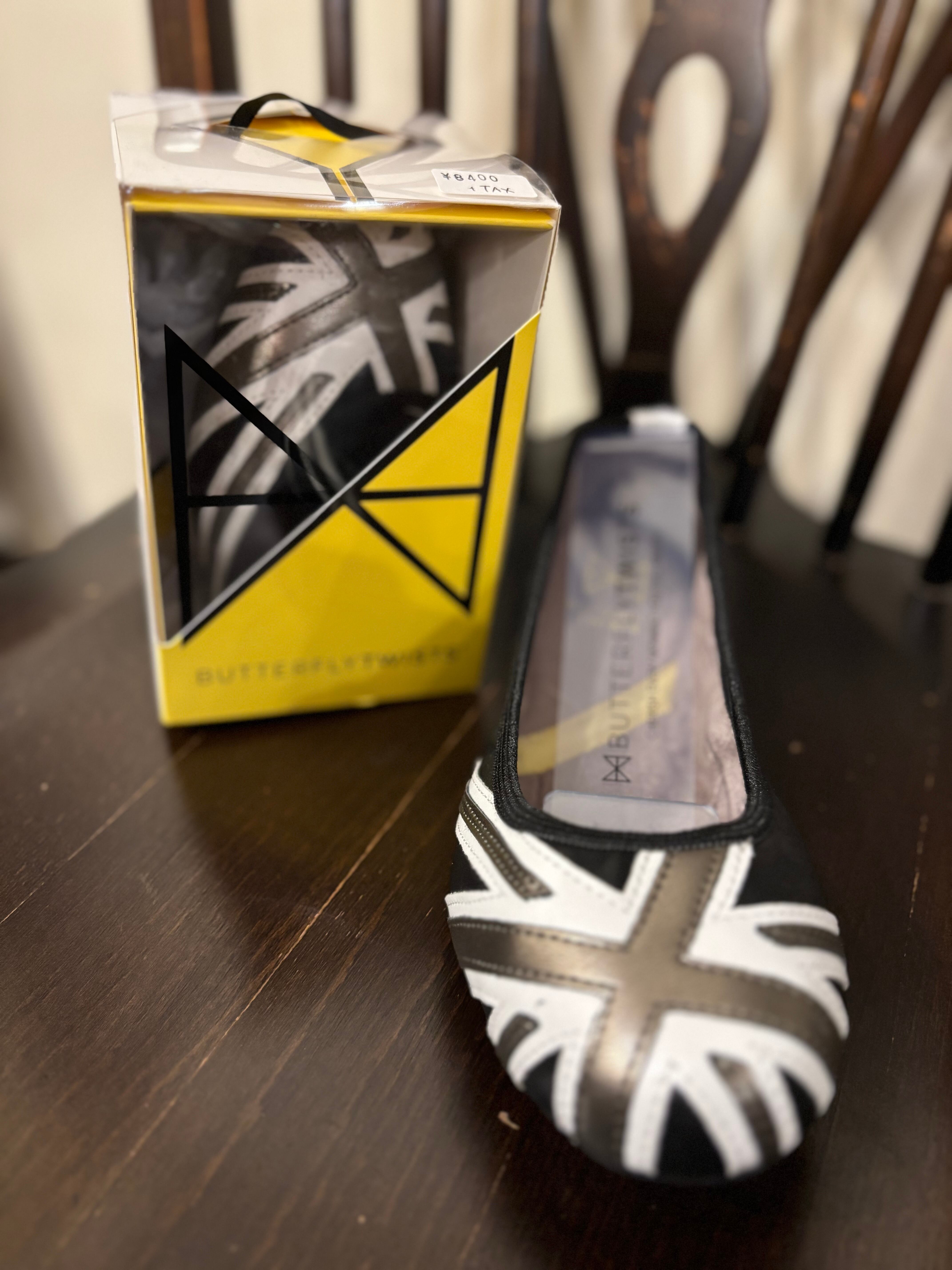 「ジャッキー」は、イギリスのユニオンジャックをデザインした一足で、バタフライツイストの発祥地からのインスピレーションを感じさせます♪とっても軽くて可愛い!こちらは定番カラーよりシックな感じです〜❤︎ポーチ付き。