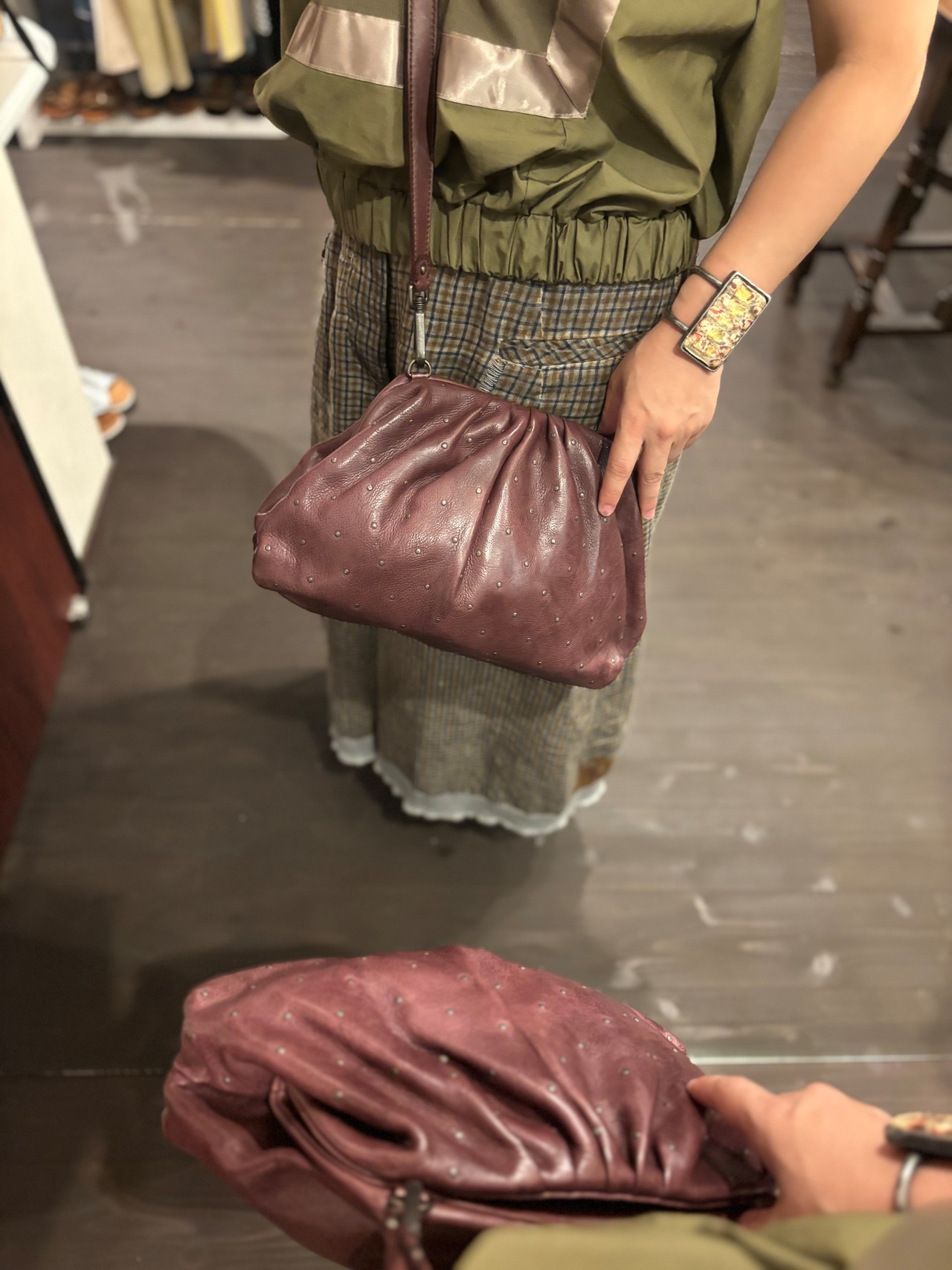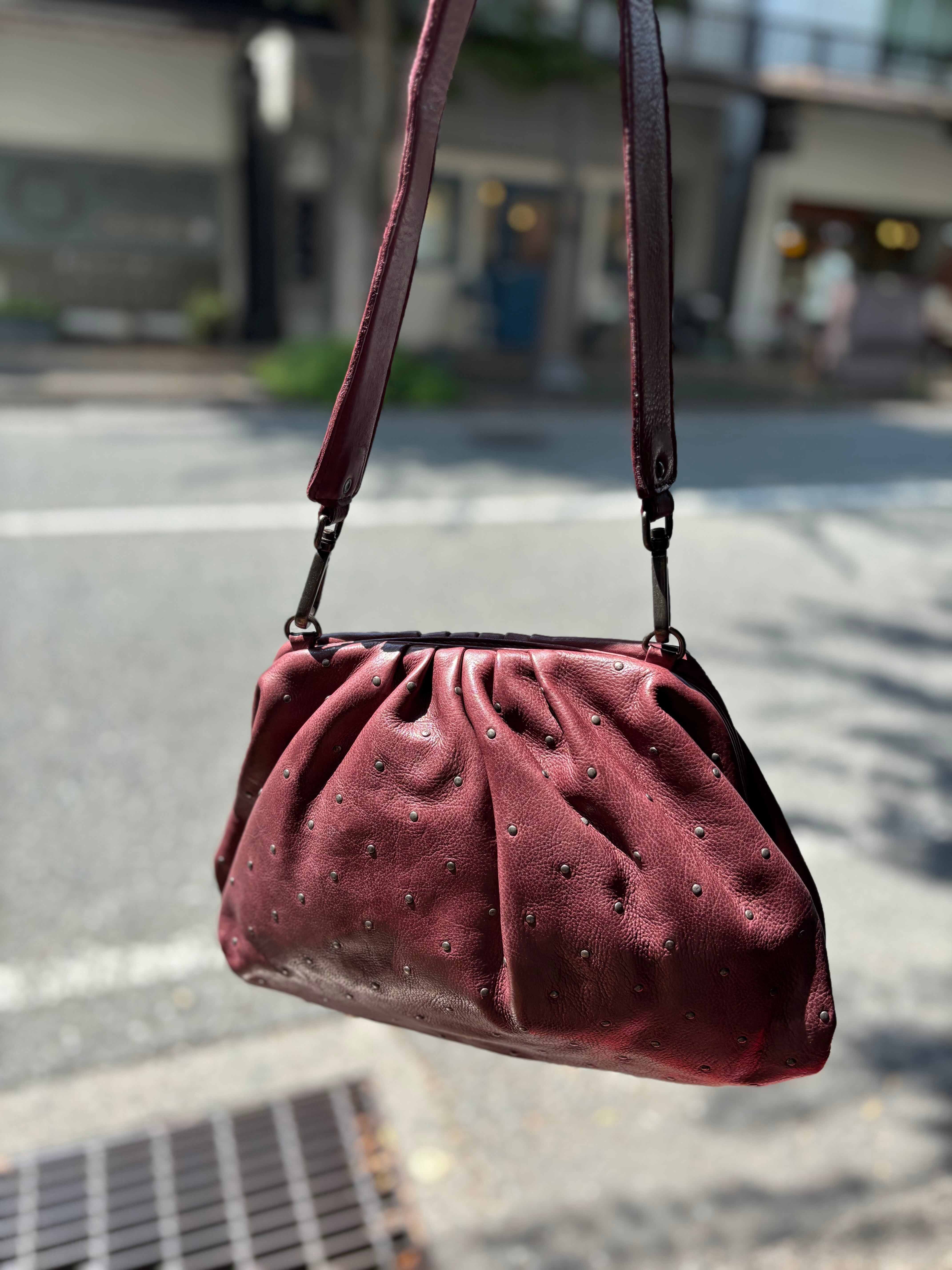ウォッシュ加工を施した牛革を使用したクロスボディバッグ。フロントに小さなスタッズをあしらった装飾。マグネット開閉式。取り外し可能なショルダーストラップ。長さ調節・取り外し可能なショルダーストラップ。内ポケット付き。コットンライニング。ヴインテージ加工され柔らかくなったレザーで物の出し入れがしやすいしっかり口が開くタイプ。マグネットでしっかり止まります。ショルダー、ハンドともに付け替え可能、もちろんすべて取りはずしクラッチバッグとしても優秀です。