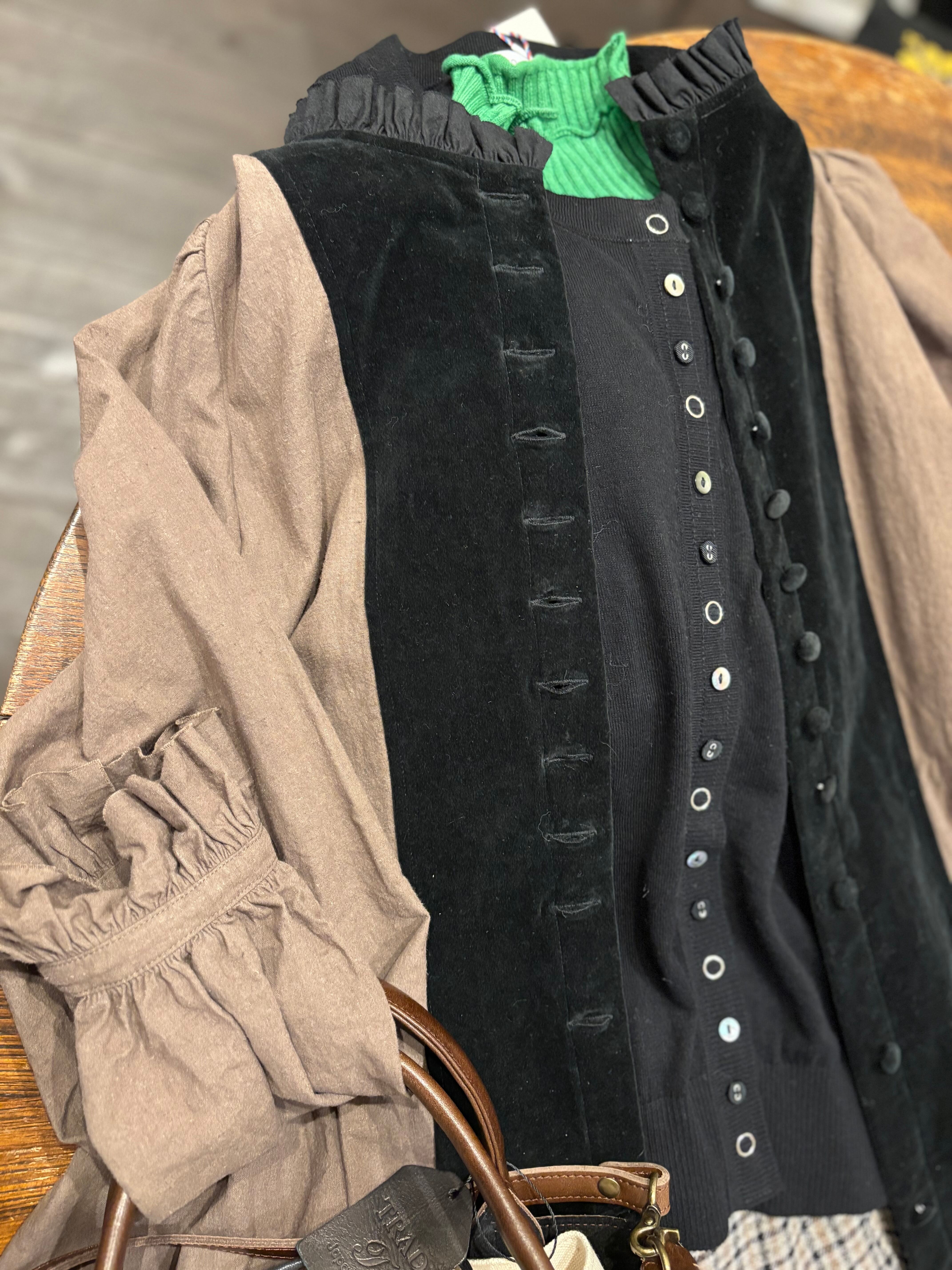 小ぶりなフリル襟と贅沢に作られたタックギャザー。すっきりとしたラインなのに