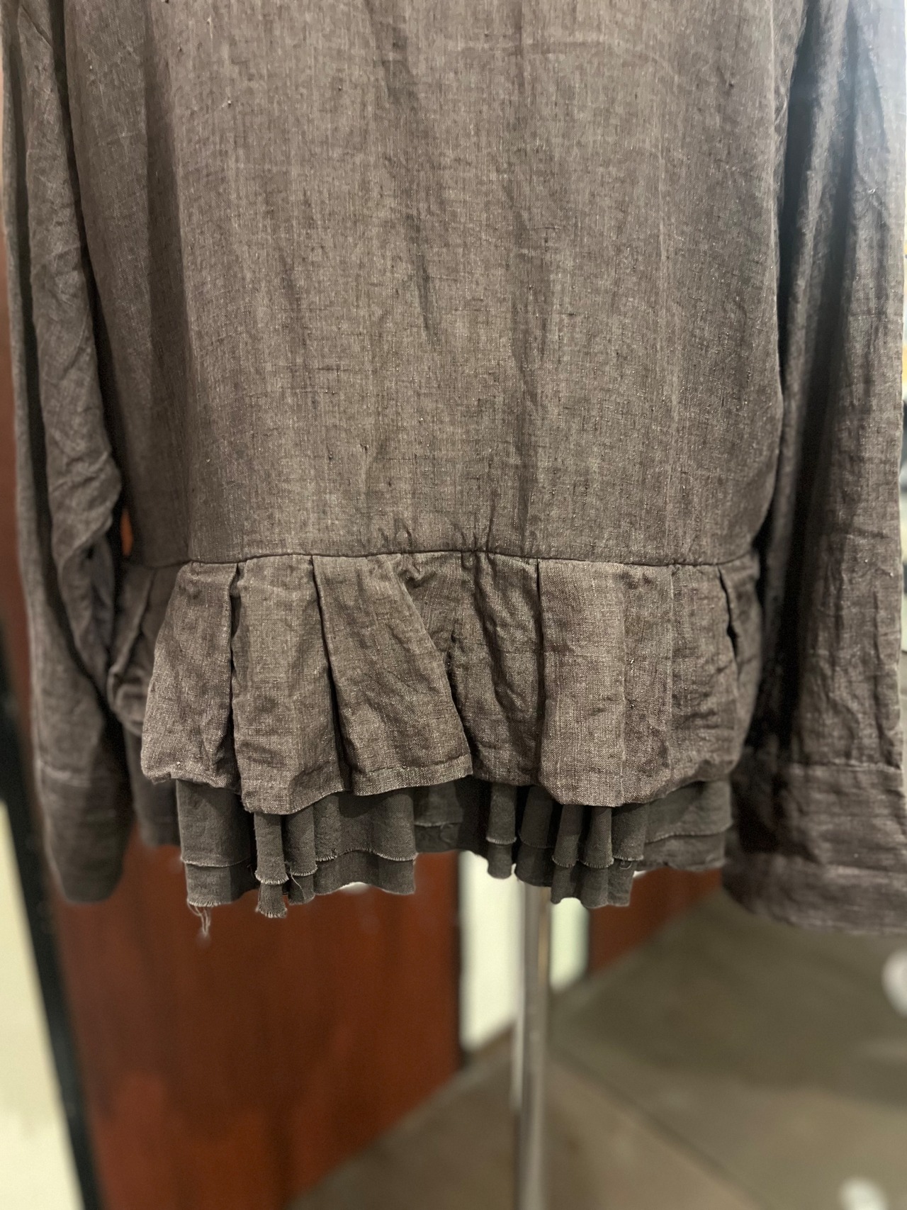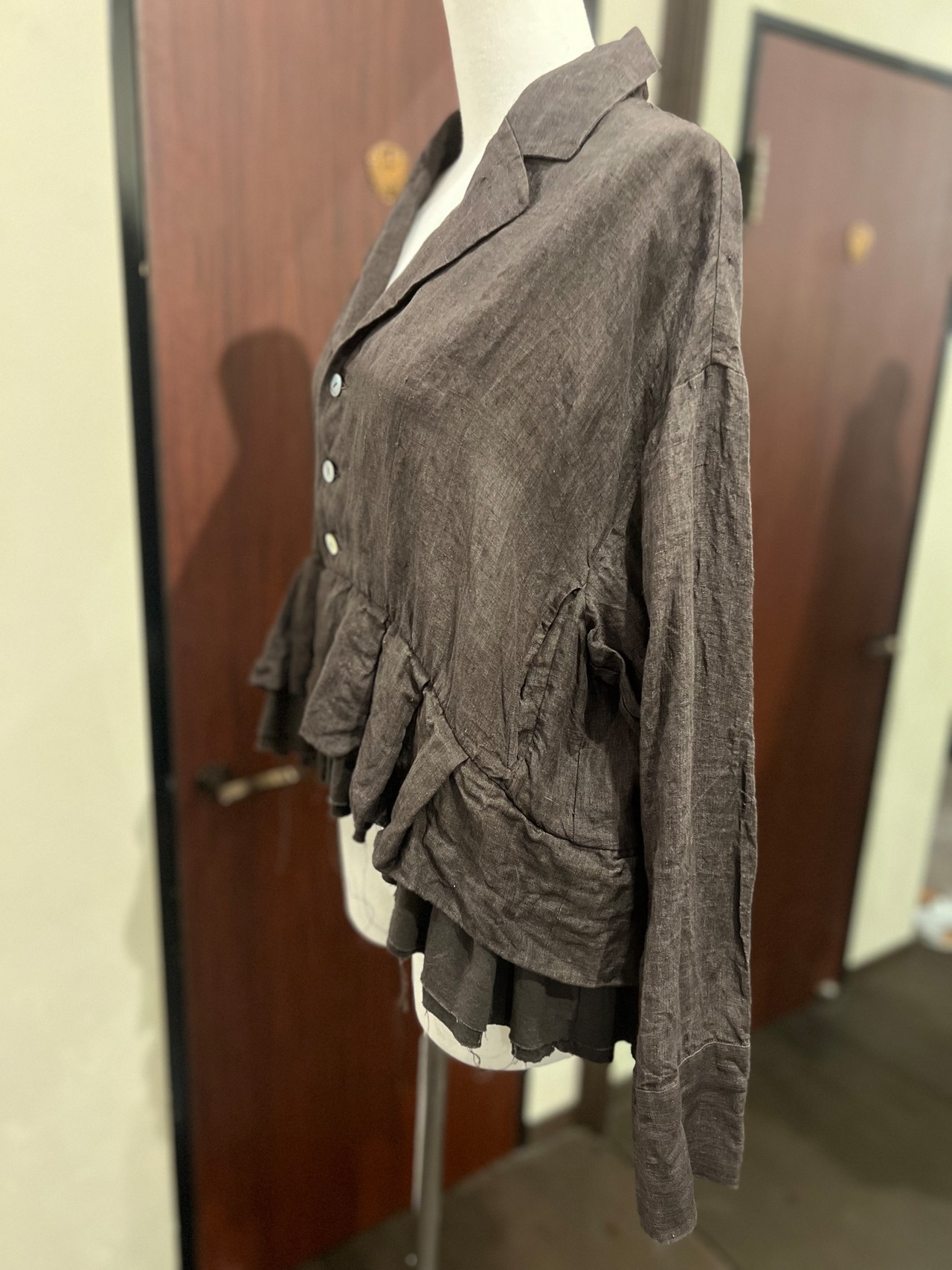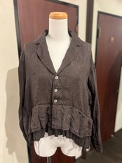 変形の前立てやギャザー使いが特徴的なシャツジャケットです。ペプラムにはギャザーを寄せてボリュームを持たせて、様々なシルエットのボトムと相性の良い1枚に仕立てられています。