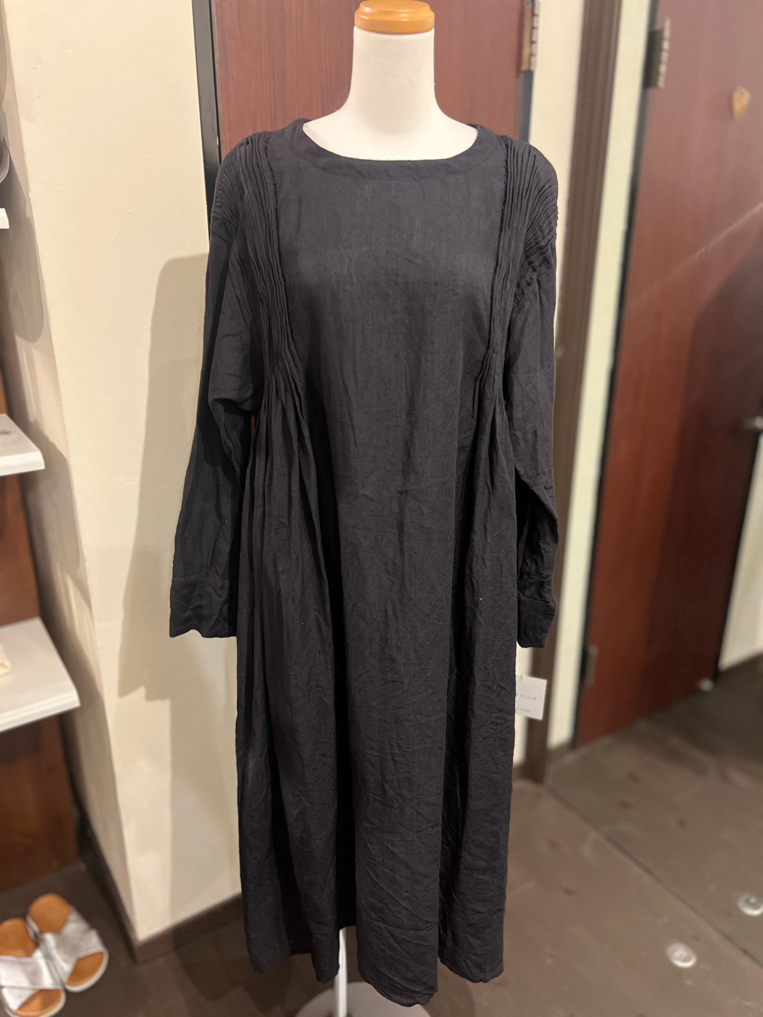 バフバフした手触りが楽しいリネンのワンピース。こまかく入っているタックやハンドステッチの感じもアンティークで素敵です。タートルや長袖を入れてオールシーズン活躍します♪