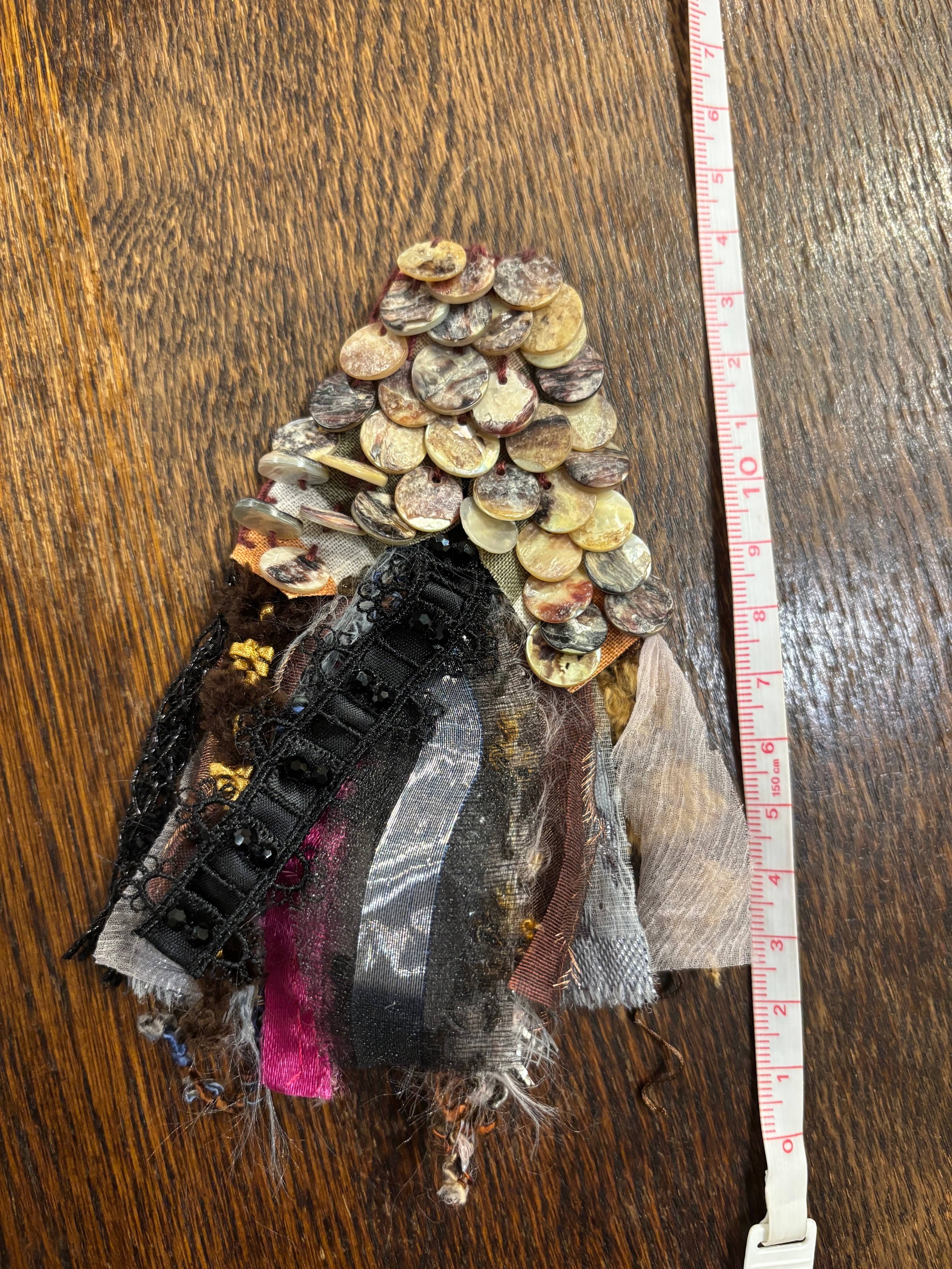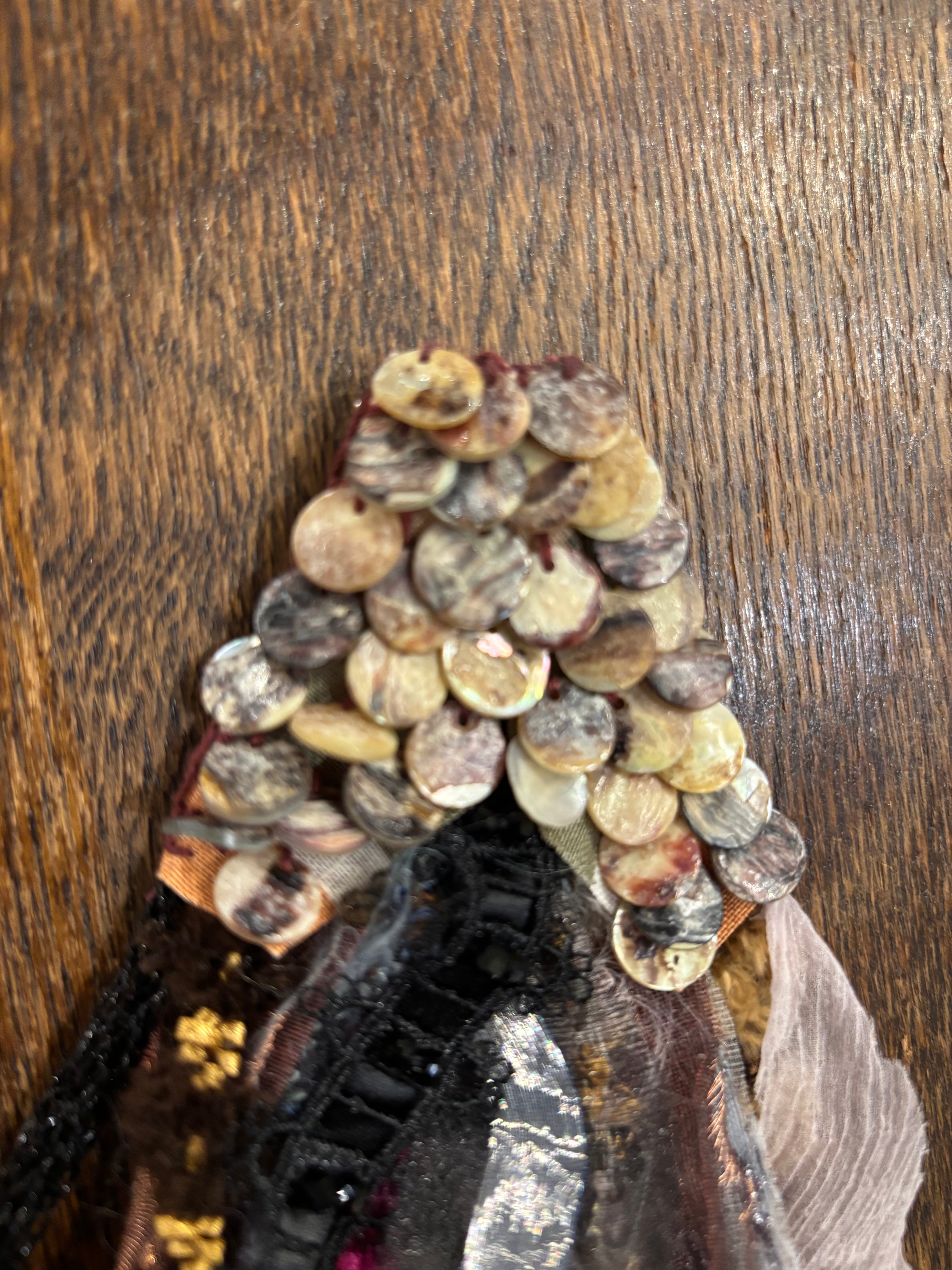 2025年秋冬コレクション新作。いろんな異素材があしらわれたすべてハンドメイドの存在感のあるコサージュです。光が当たるごとにいろんな風合いを楽しませてくれます。鱗のような光輝く貝とファーやラメやレースの存在感がとてもある素敵な作品です。BOX入りでプレゼントにも♪