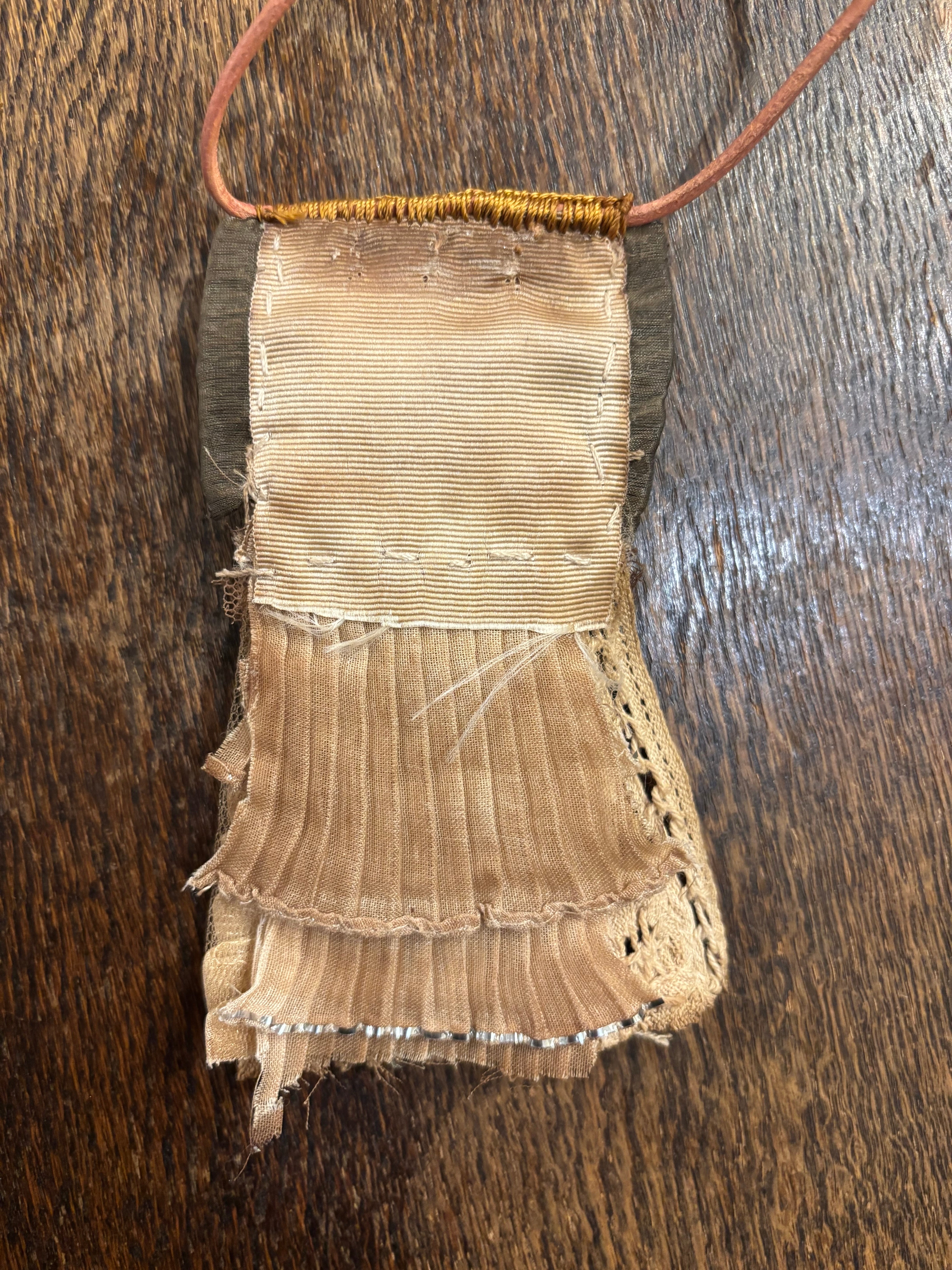 2025年秋冬コレクション新作。いろんなビーズやレースなど異素材があしらわれたすべてハンドメイドの存在感のあるコサージュがレザーのコードがつき、ネックレスになりました。こちらの作品はオーダーによるもので、世界でもメジャーコードと本店のみでのお取り扱いで、とても貴重です☆彡