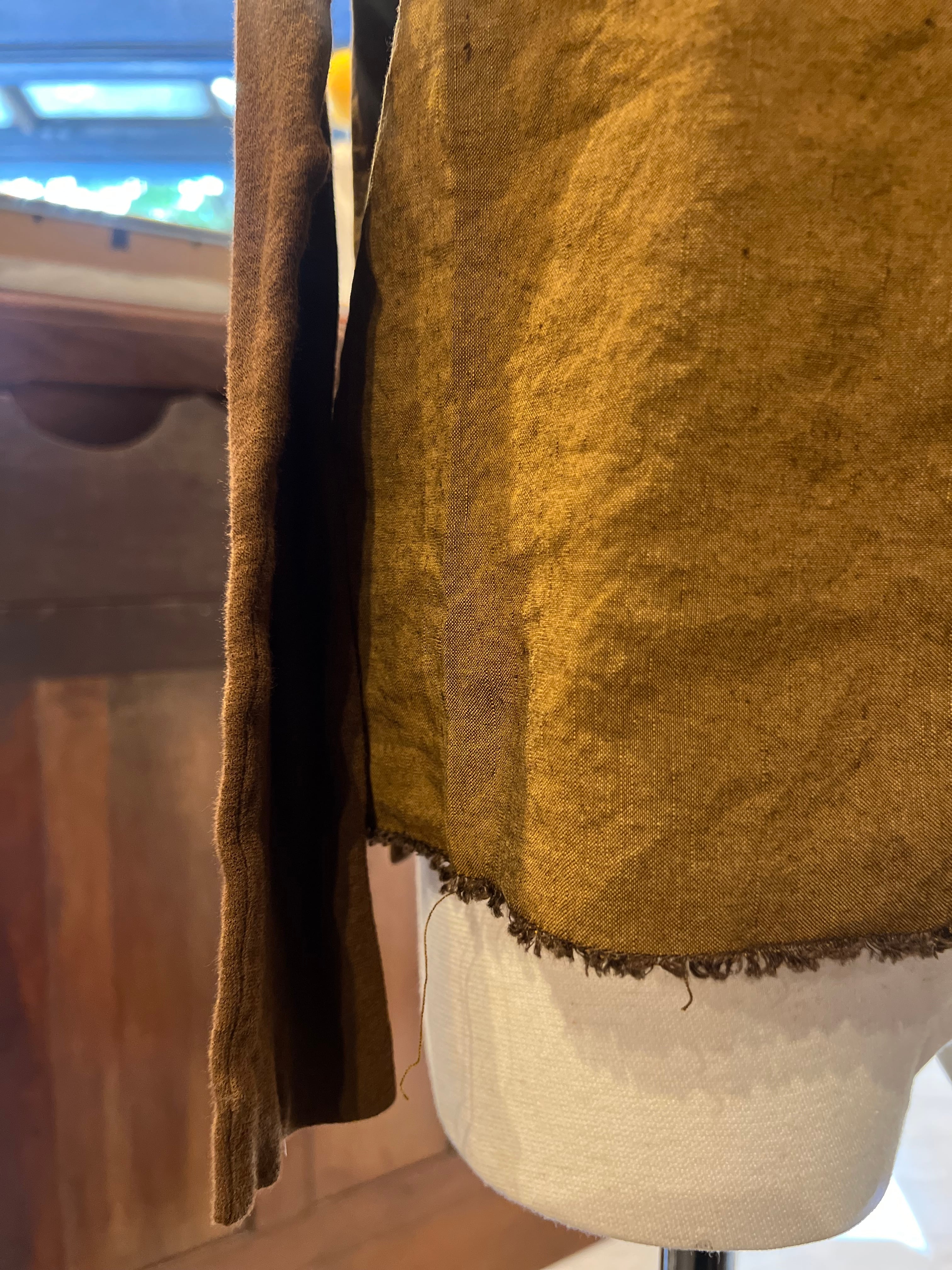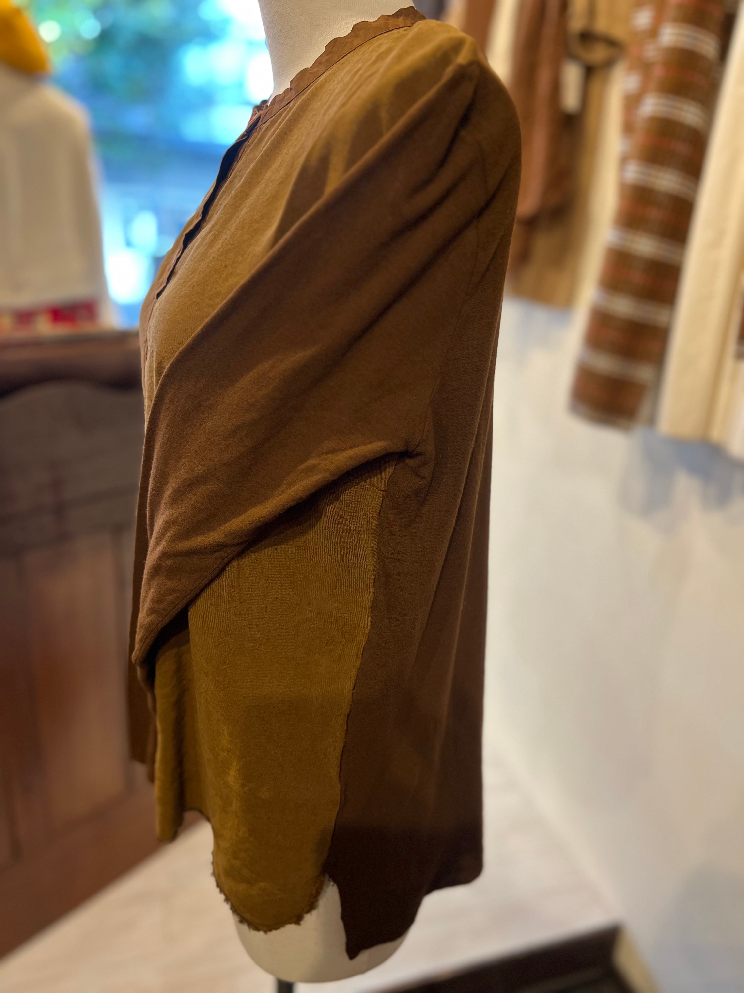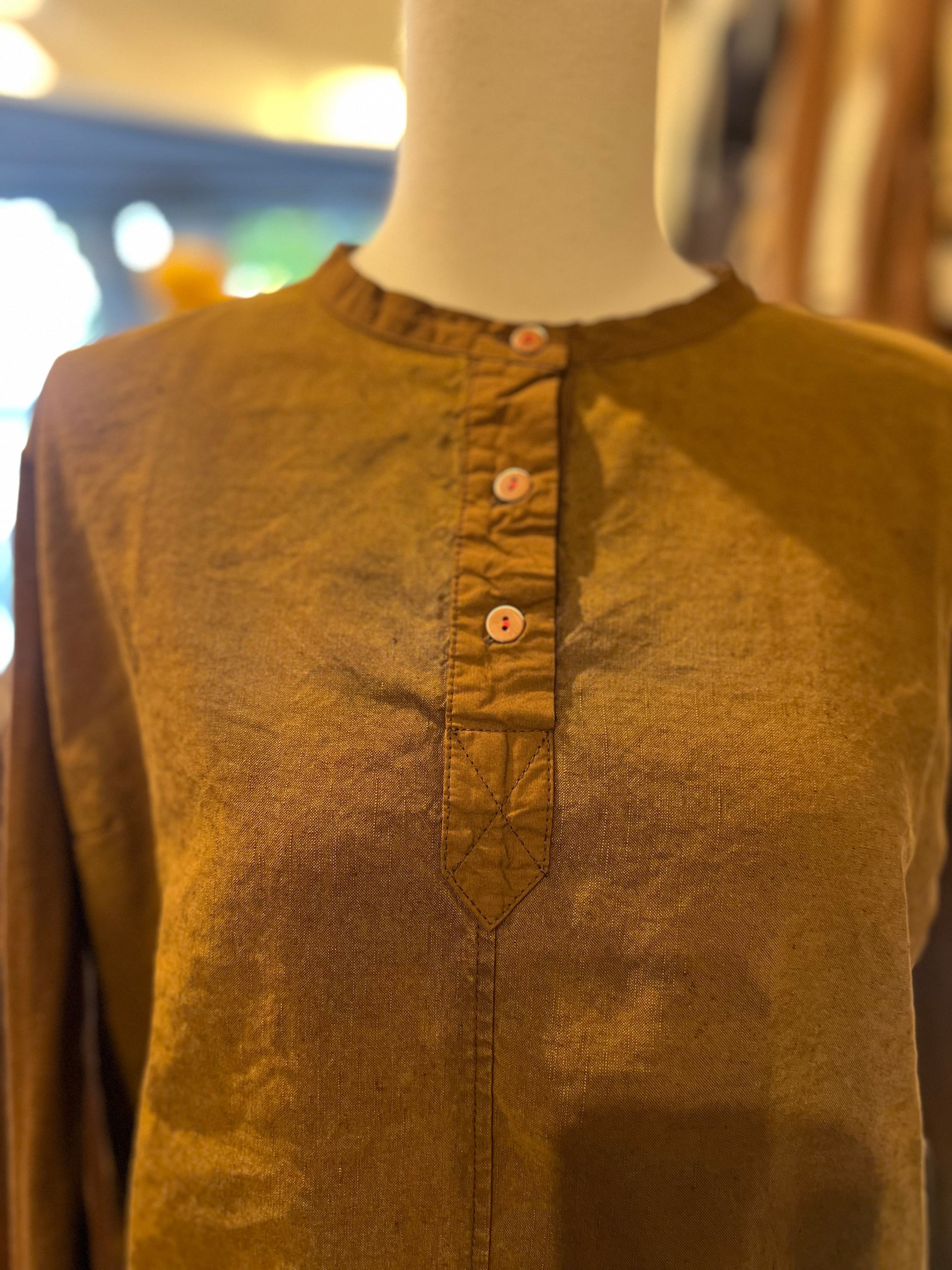 後染めの色の深さと独特な手触りもhannohならでは。袖と後ろ身頃は伸縮性もありぴったりしすぎない適度にふんわりした感じの生地感がとても好評です。カットソーとして一枚持っているとコーデに活躍しそう!ヘンリーネックもシャツ変わりになるので、とてもかっこいいです!