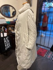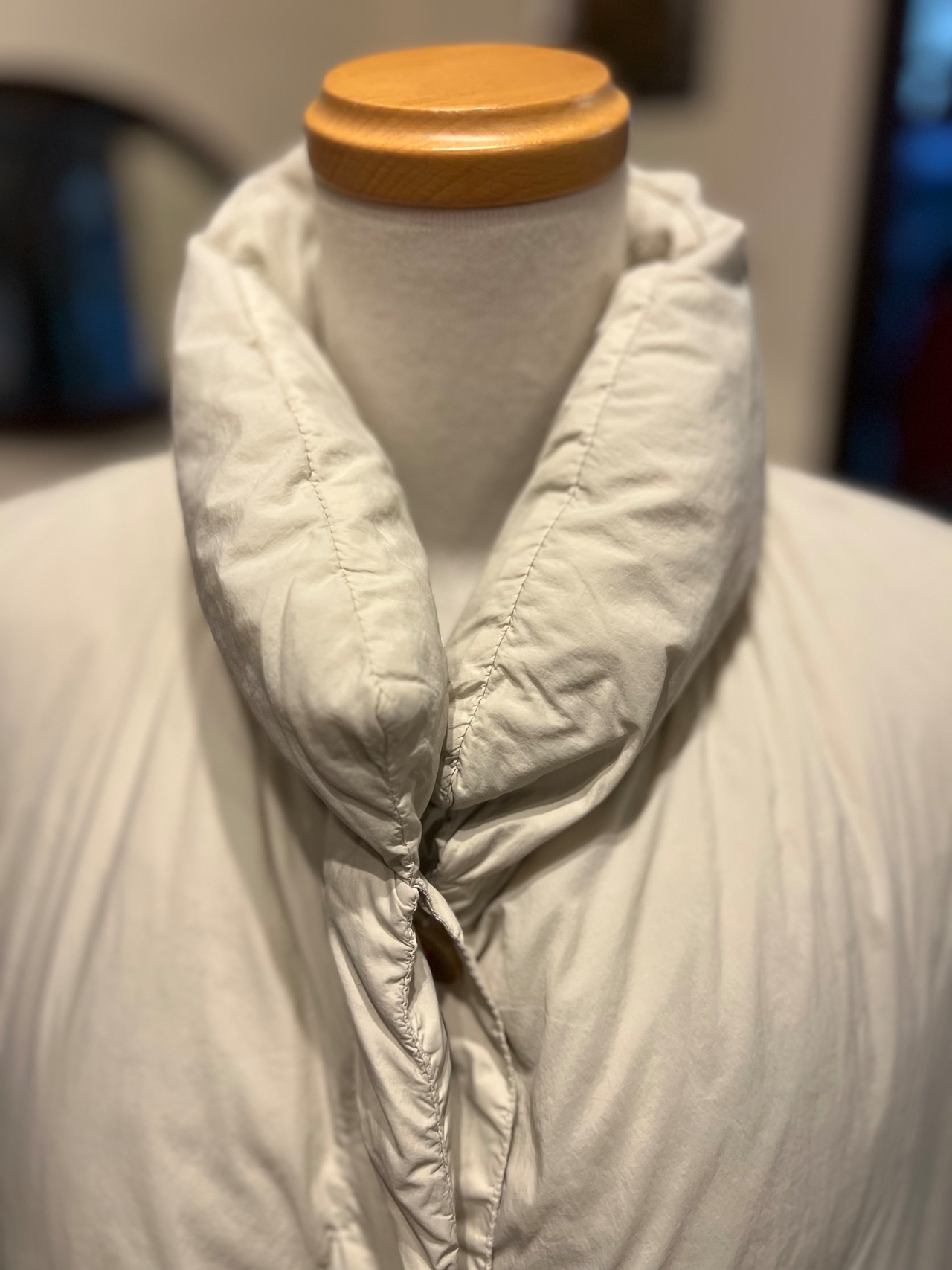 袖を通すと驚くほど軽量で包み込まれるようなふんわりとした温かさ。合成繊維よりも保温性高く体を温めてくれます。ポリアミドは丈夫さ、伸縮性、速乾性、耐摩耗性から、スポーツウェア、アウトドア用品でも多く使用されている素材なので気軽にデイリーでも楽しむことができそうです。昨今寒くなると言われている冬におしゃれにそなえてください♪首まわりも風が入らずあったかです!いろもサンドで白すぎず透明感がありとても素敵です。