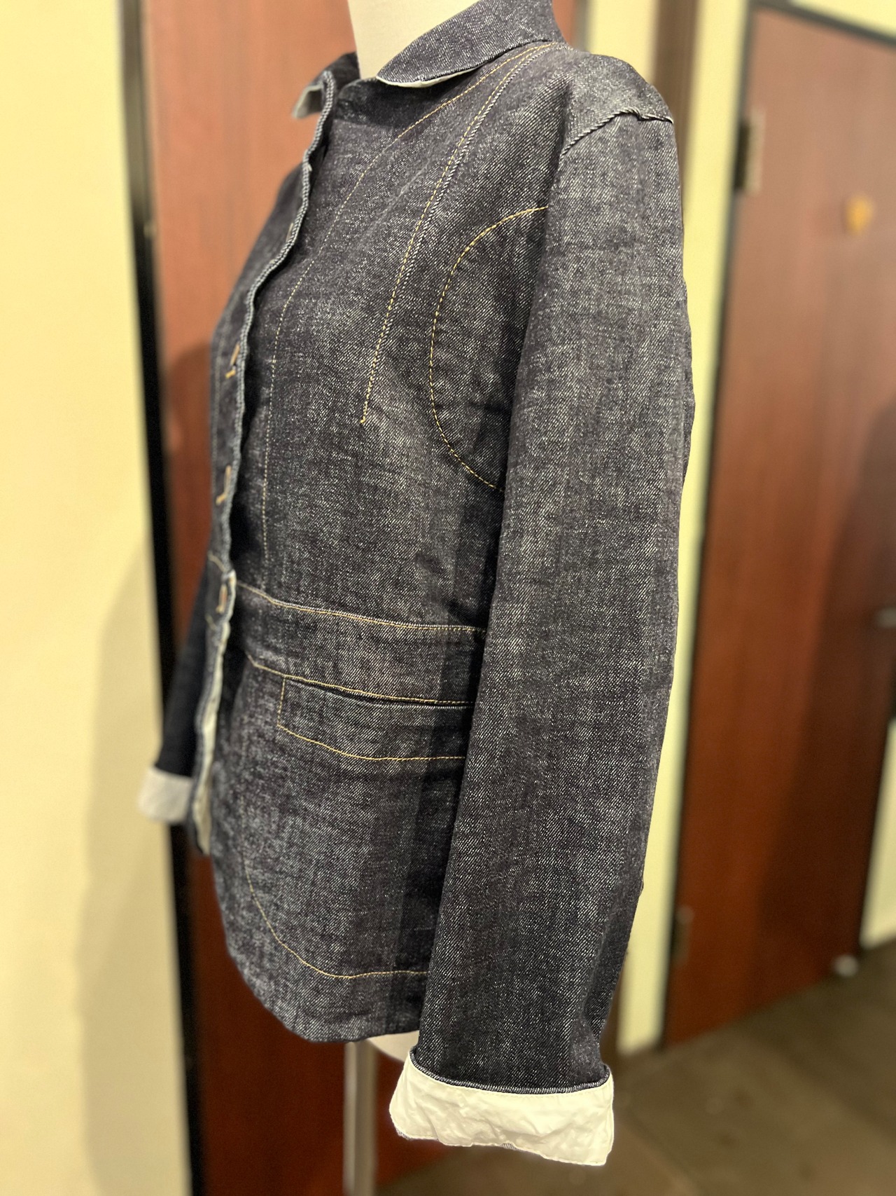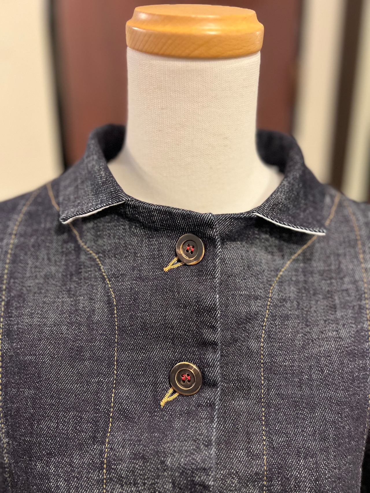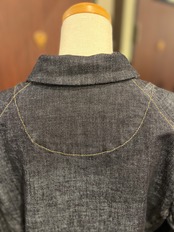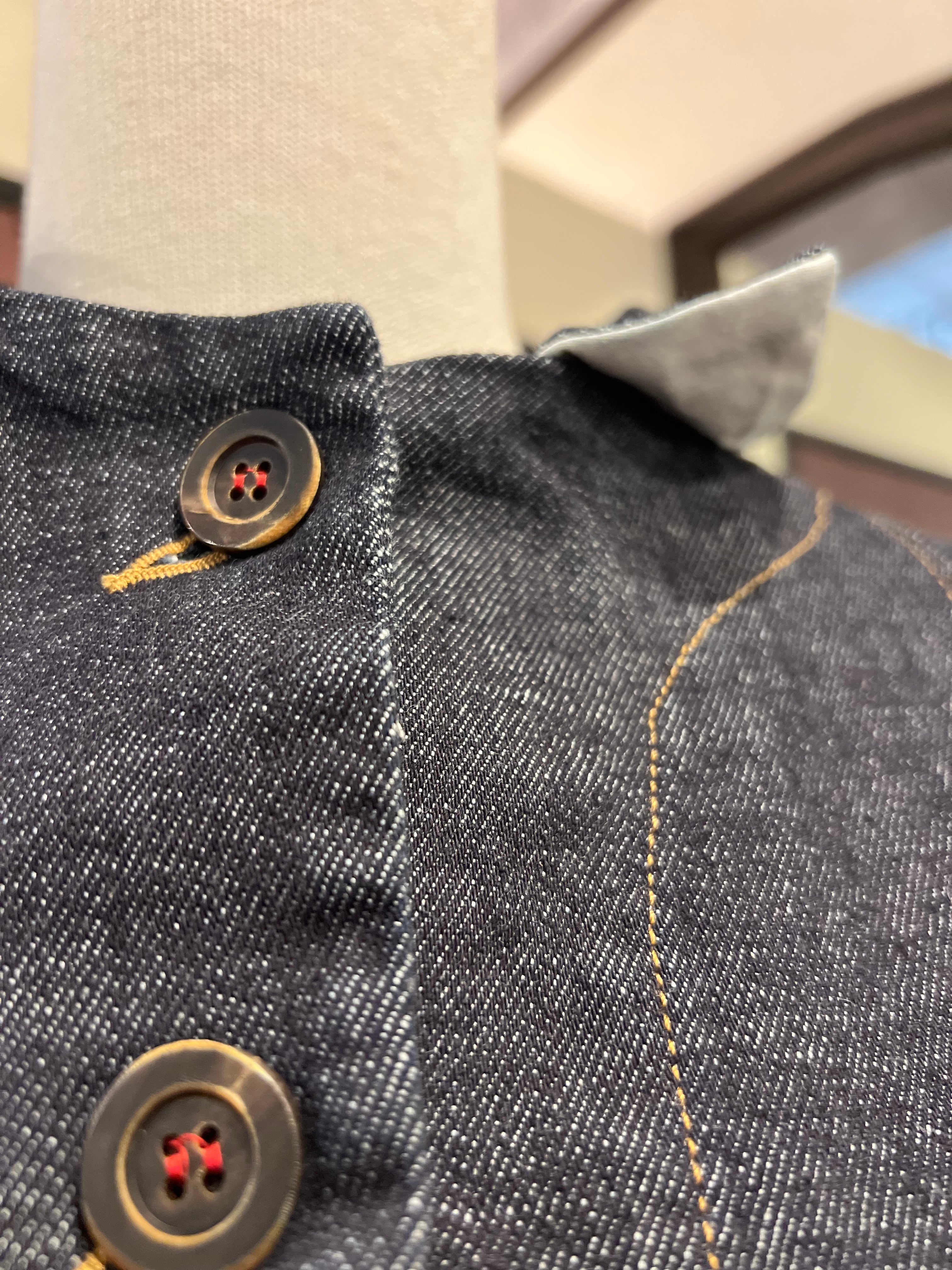 特徴的なパッチポケット2つ。HANNOHならではの特徴的な赤い糸のディテールが施された5つのボタンフロントも目を引く素敵なデザインです。