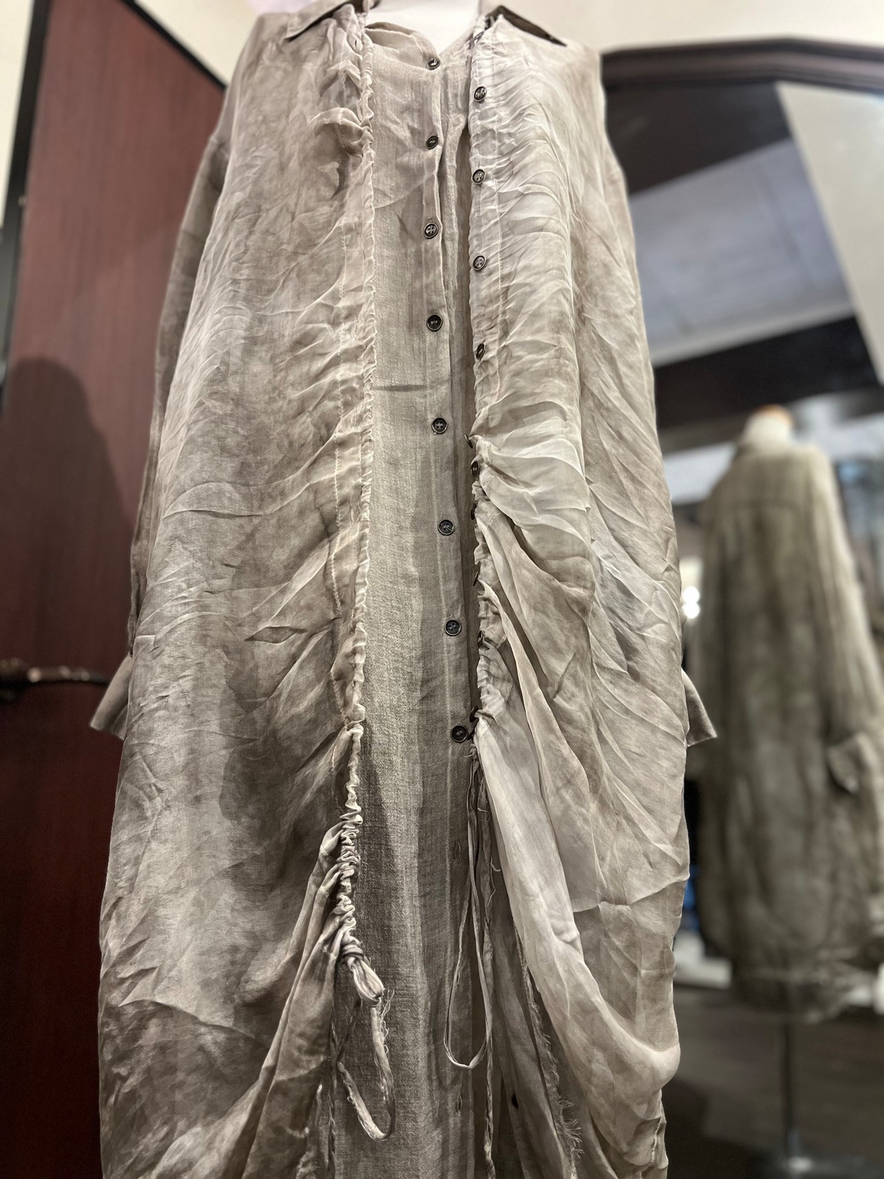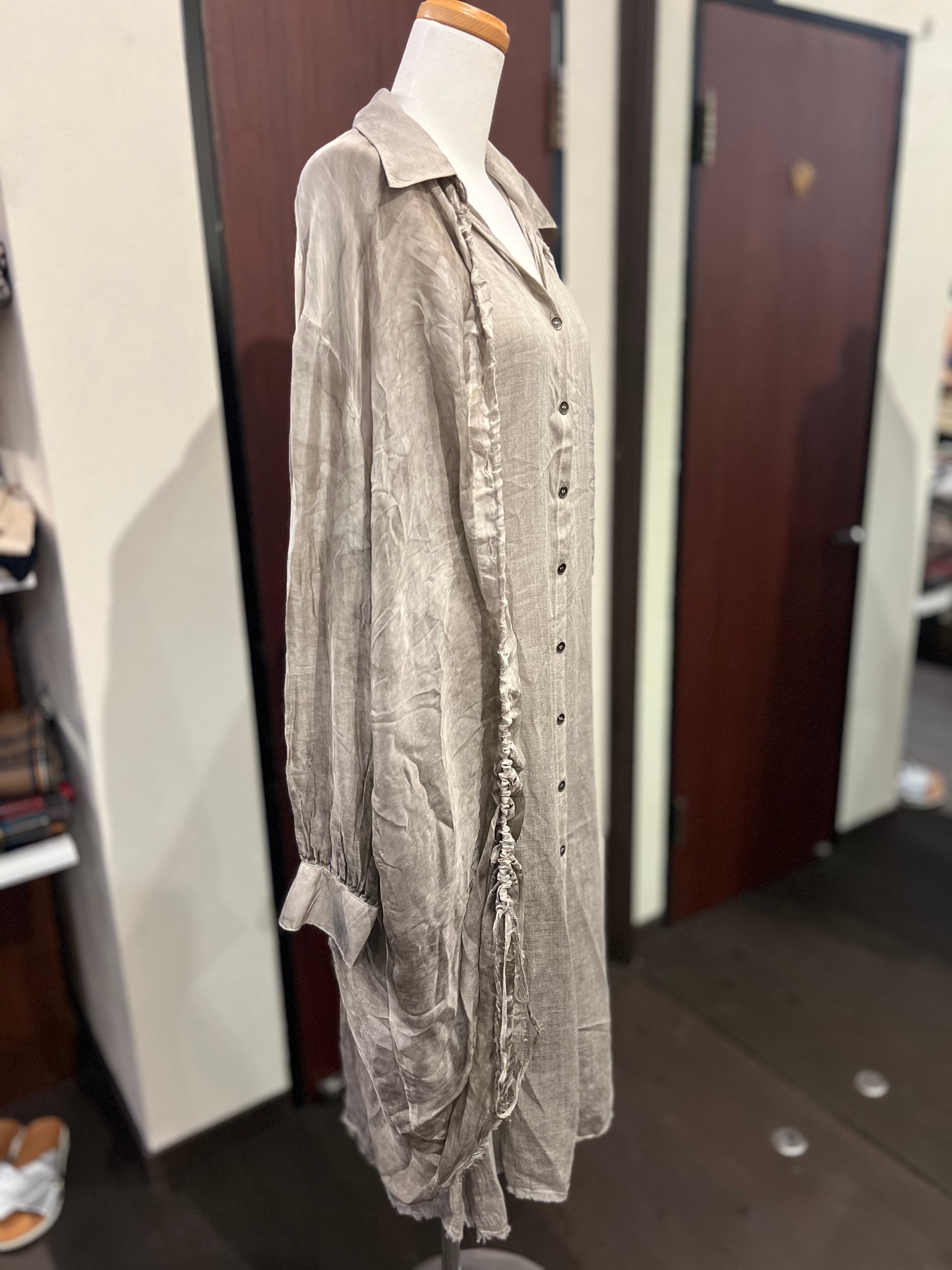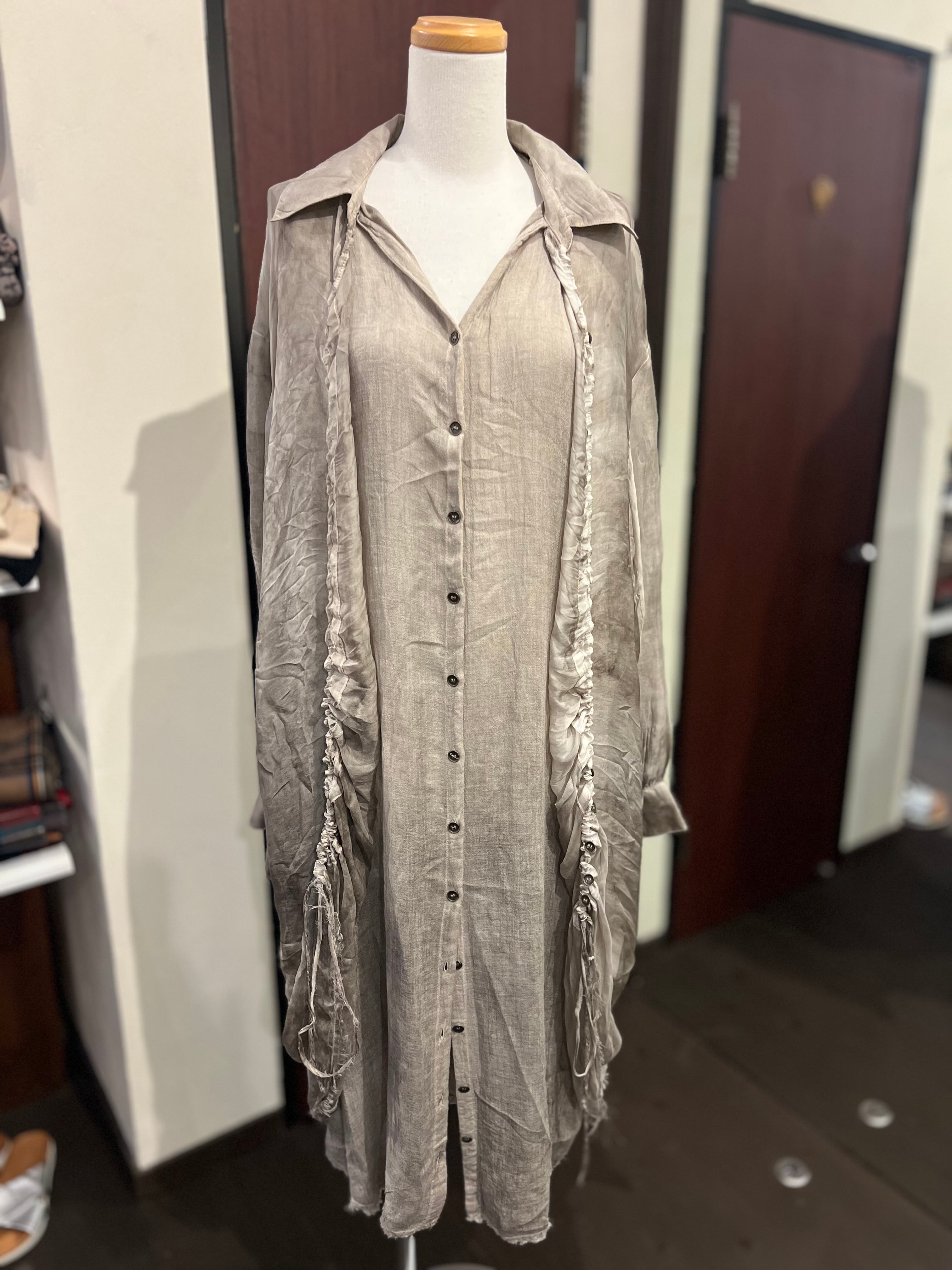 透け感のある異素材を使用したワンピース。シーズン問わずご愛用いただけます。光を通すシアーな布地とボタンのループが調節できるので、デザインもいろんなアレンジが可能。