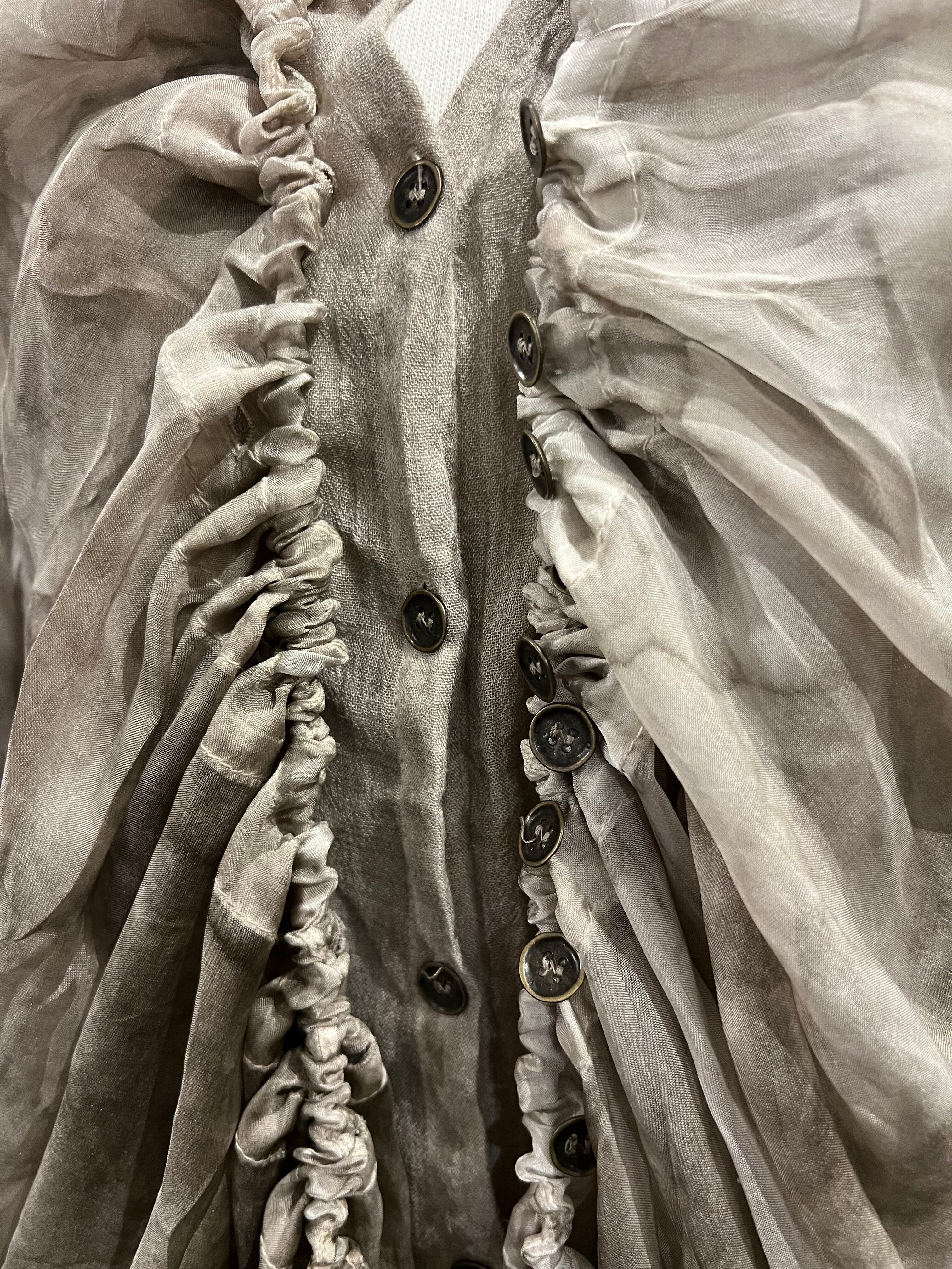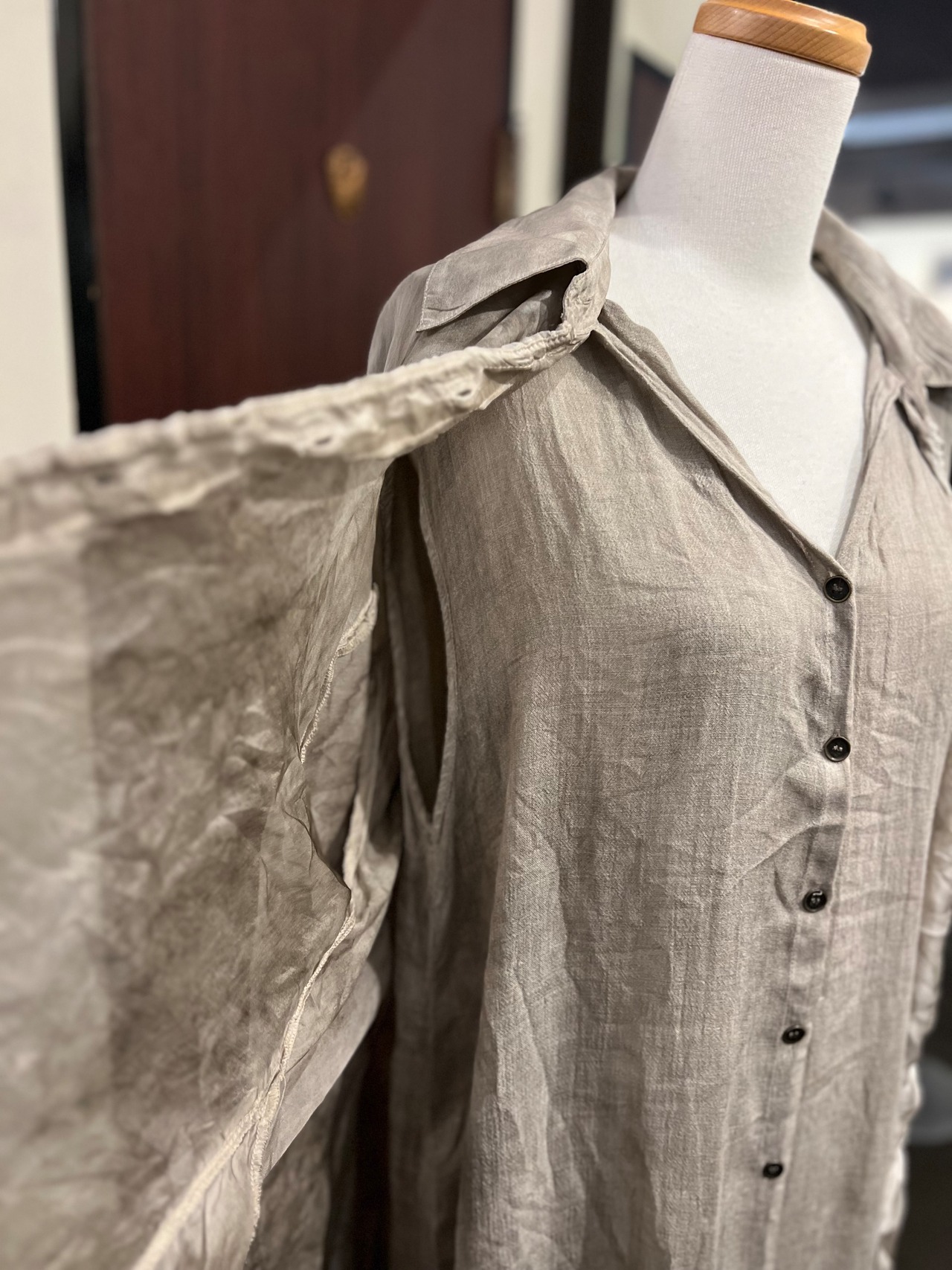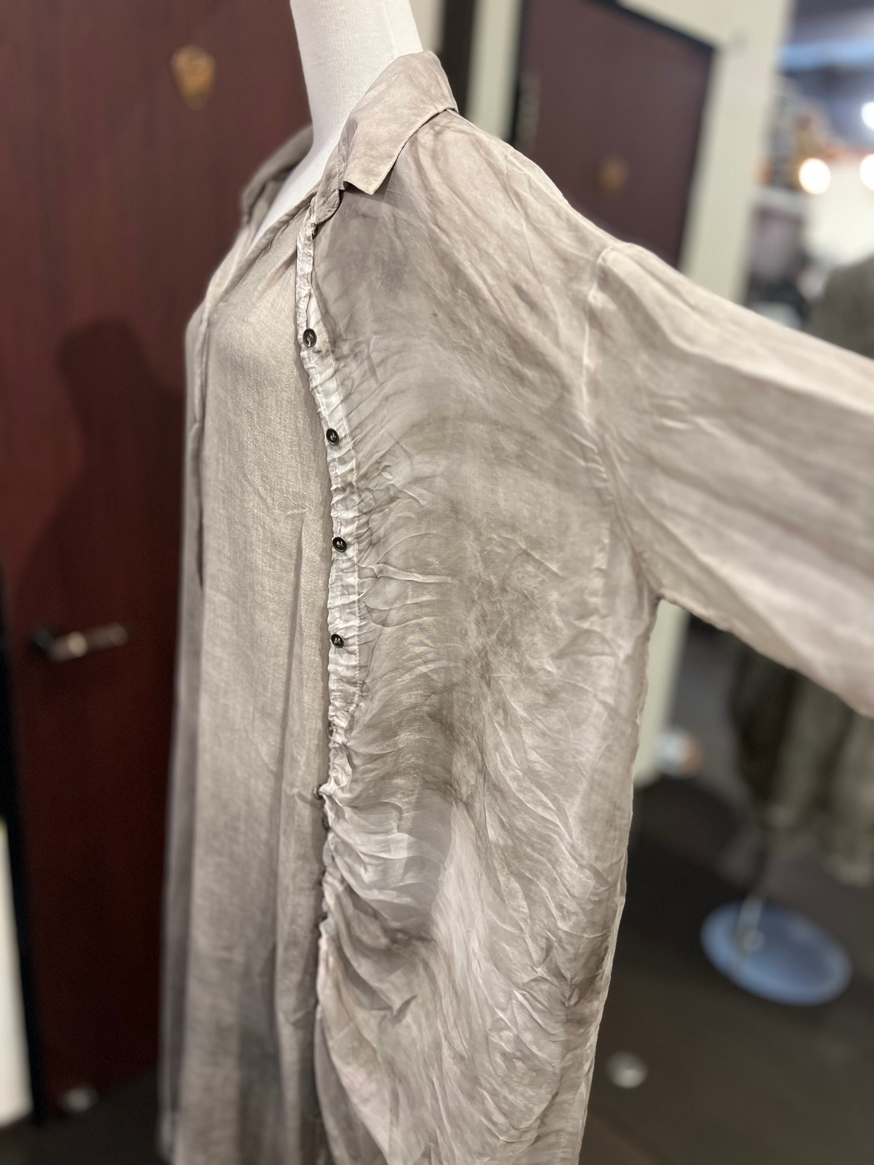 透け感のある異素材を使用したワンピース。シーズン問わずご愛用いただけます。光を通すシアーな布地とボタンのループが調節できるので、デザインもいろんなアレンジが可能。
