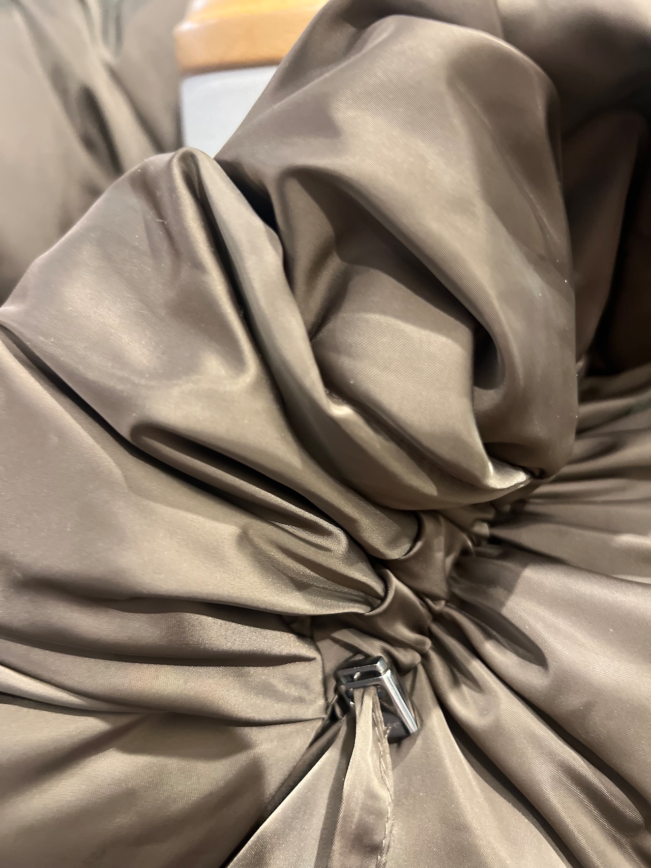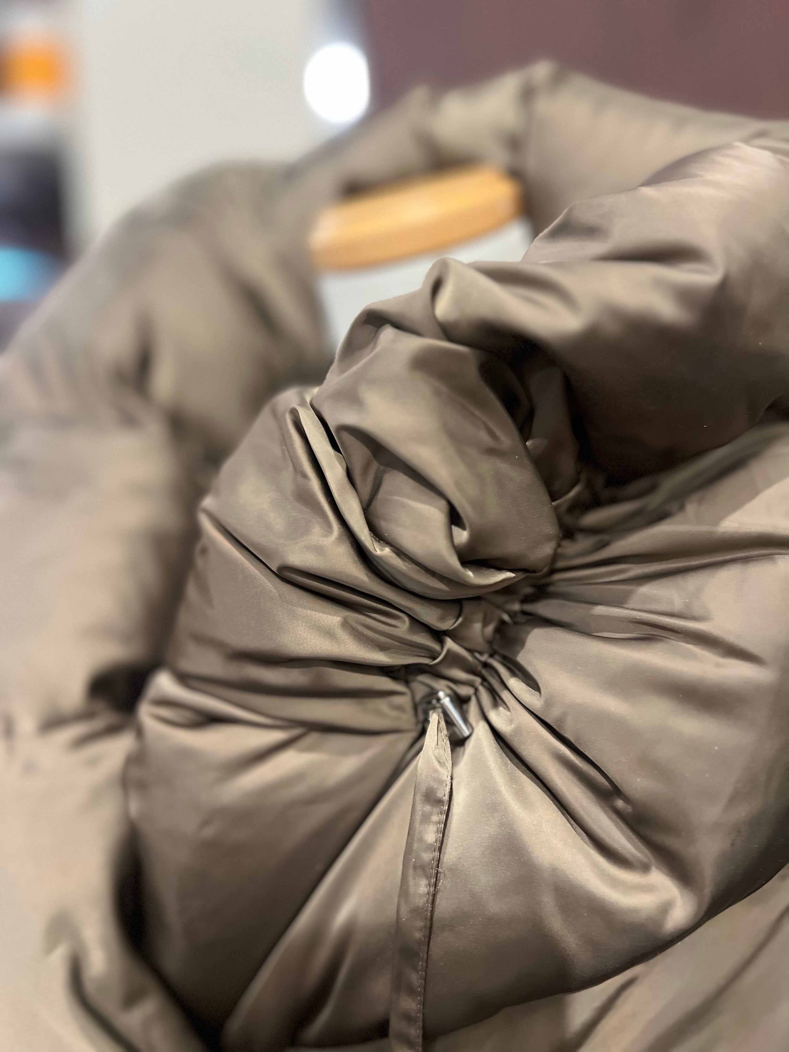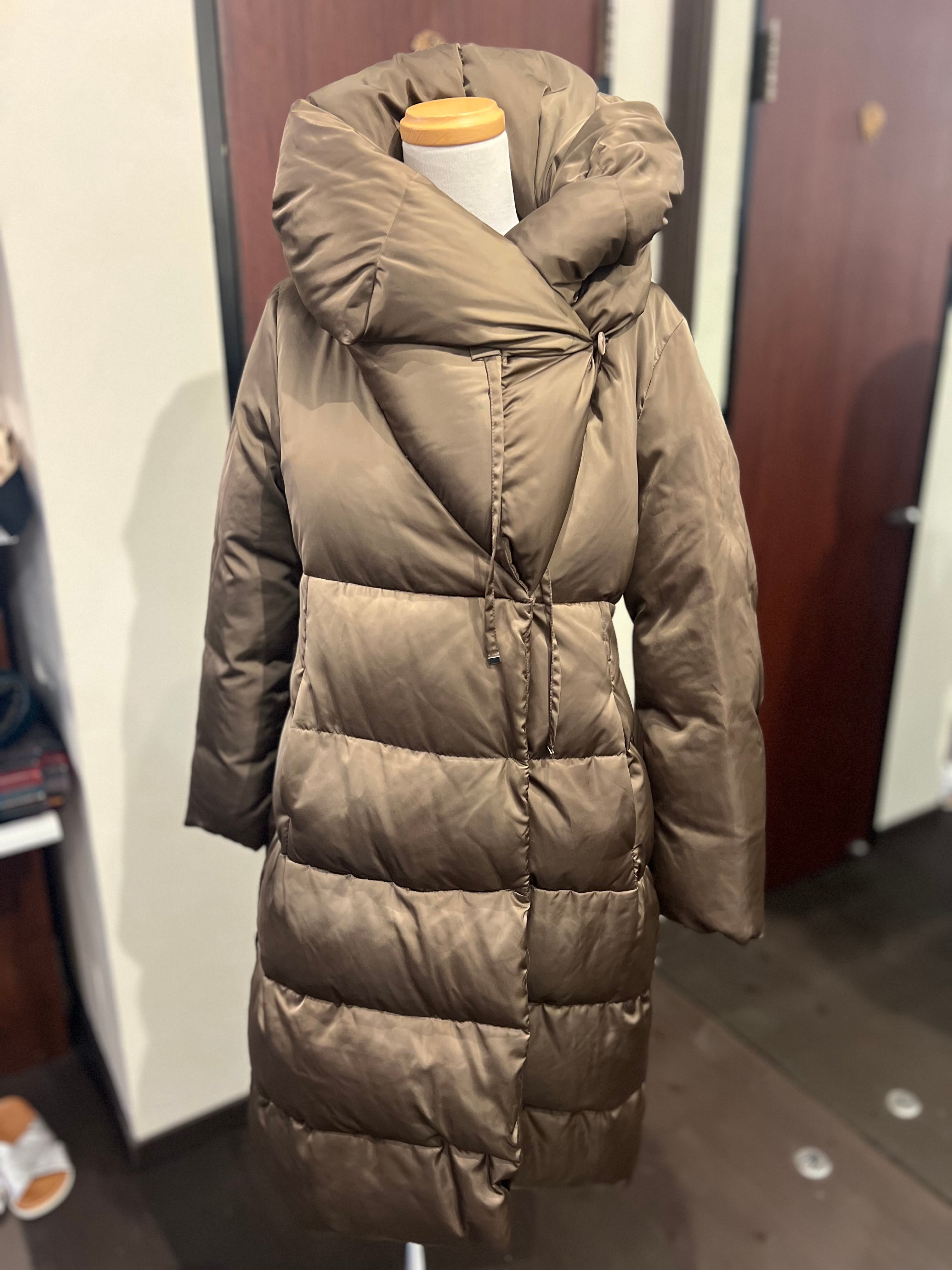 軽くてシルエット良好、着ぶくれ感なくふんわりと包まれるようなあたたかいフェザー入りダウン。上品なシャンパンブラウン色です。
