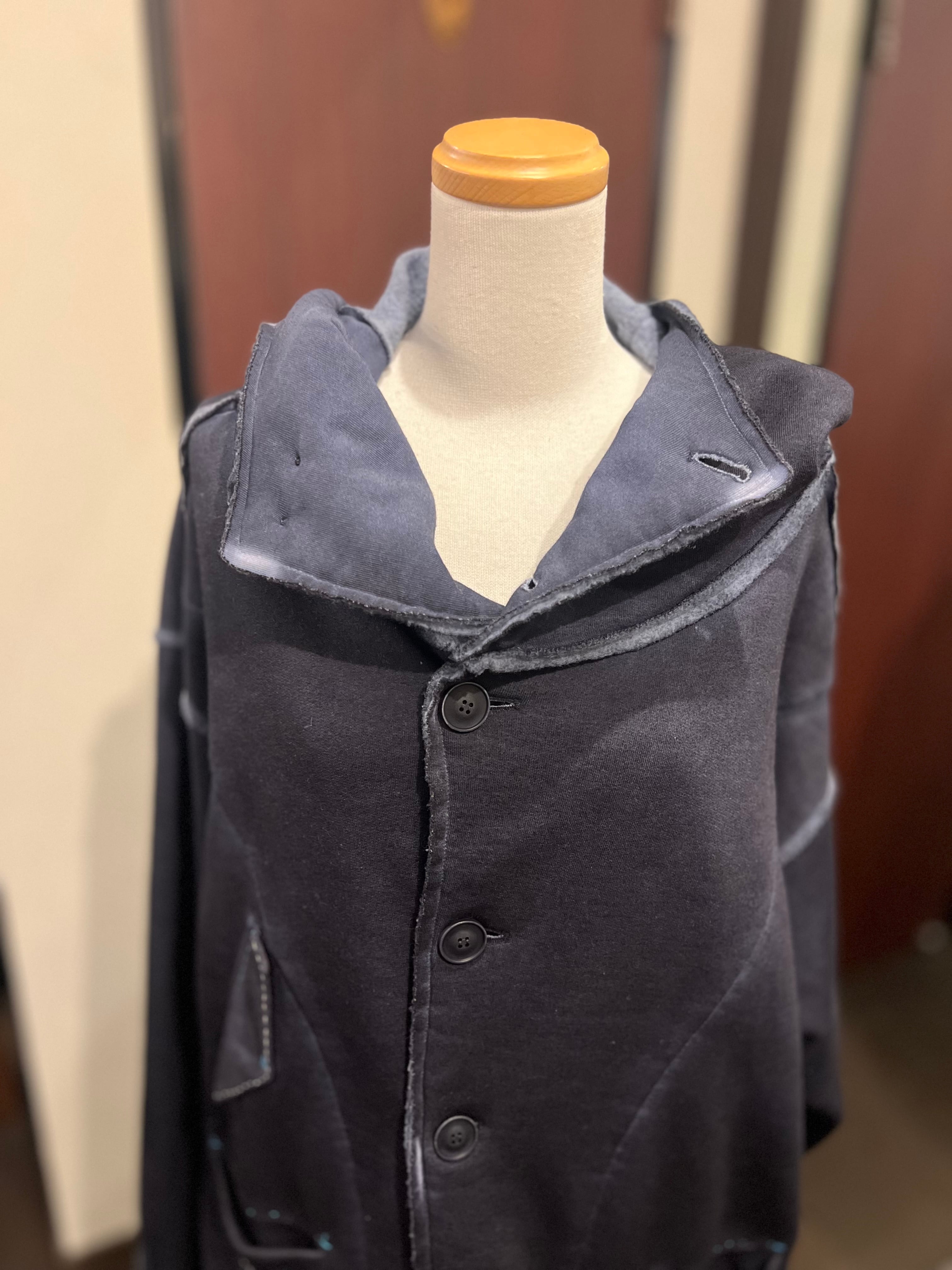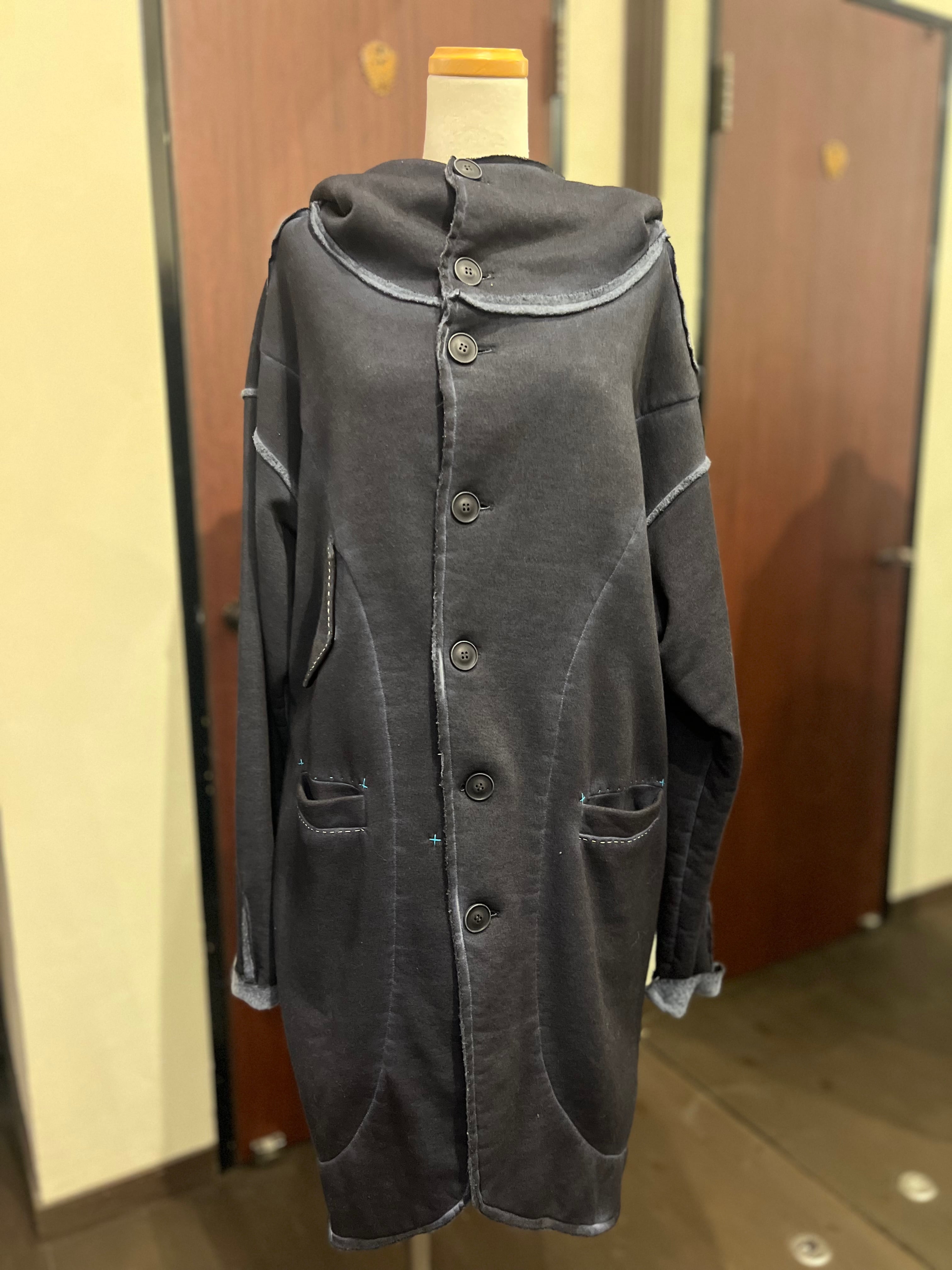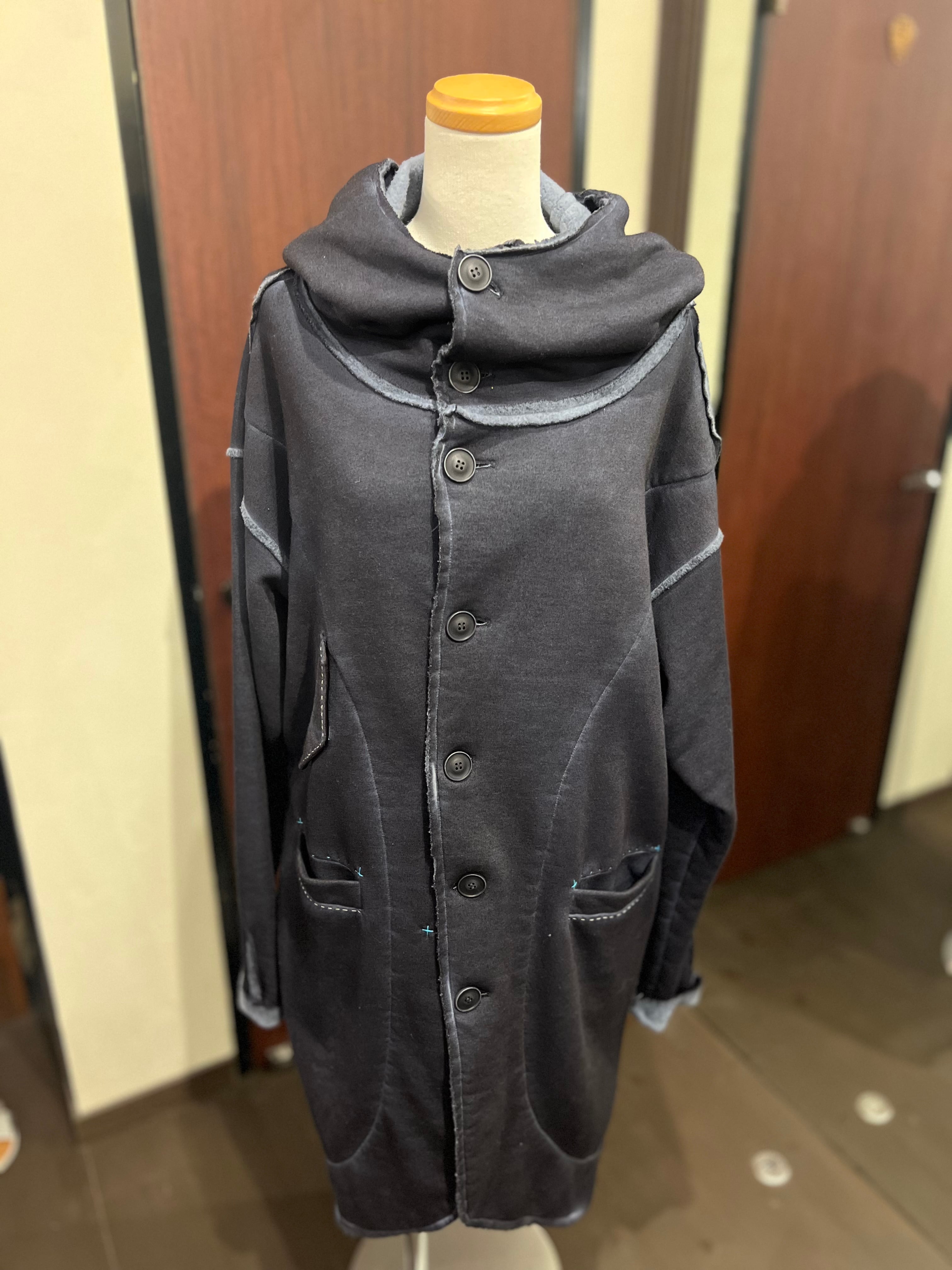 スモーキーな後染の色合いや計算されたフェミニンでありつつもmodeな素敵なコートです。かなりSize感もゆったりしておりメンズでも対応可能。ふわふわの裏毛が暖かく首元のデザイン次第でシルエットがいろいろ楽しめます。「重たいコートは苦手」「デザインで遊びたい!」という方にはぜひ着ていただきたい作品です。気持ち良い着心地はずっと着ていたくなります!こちらはブルーベース。アッシュグレー色も出品しております。