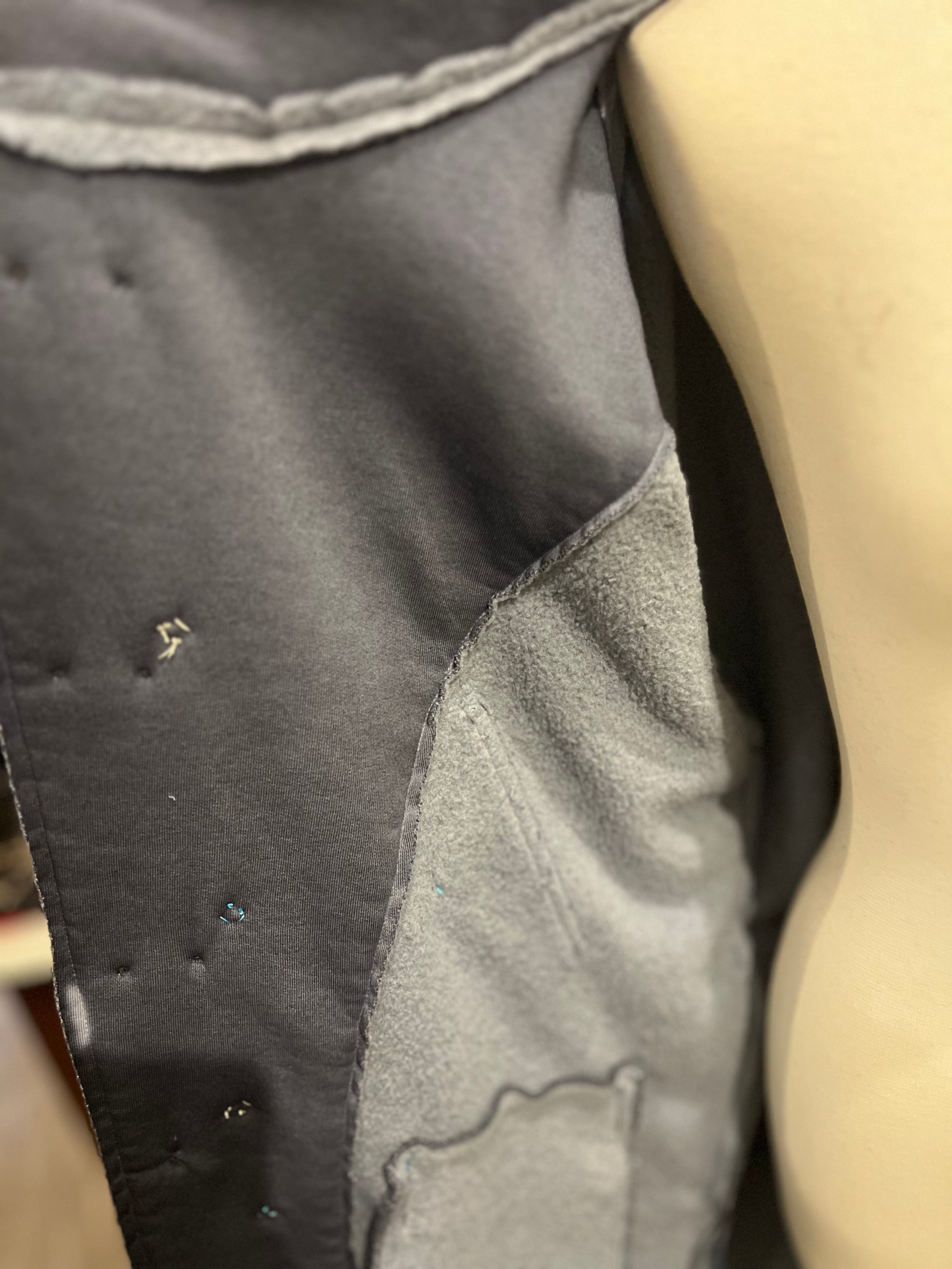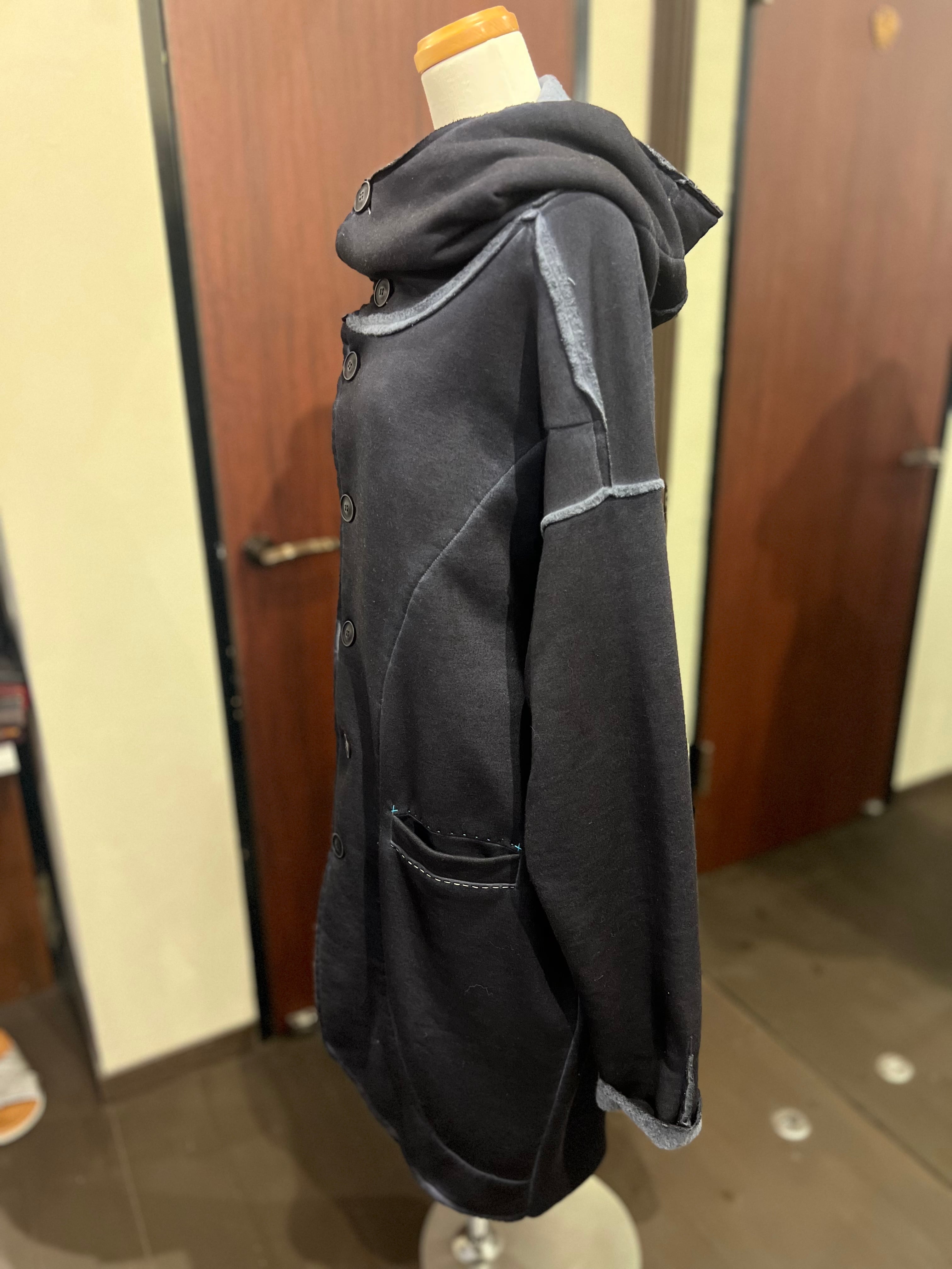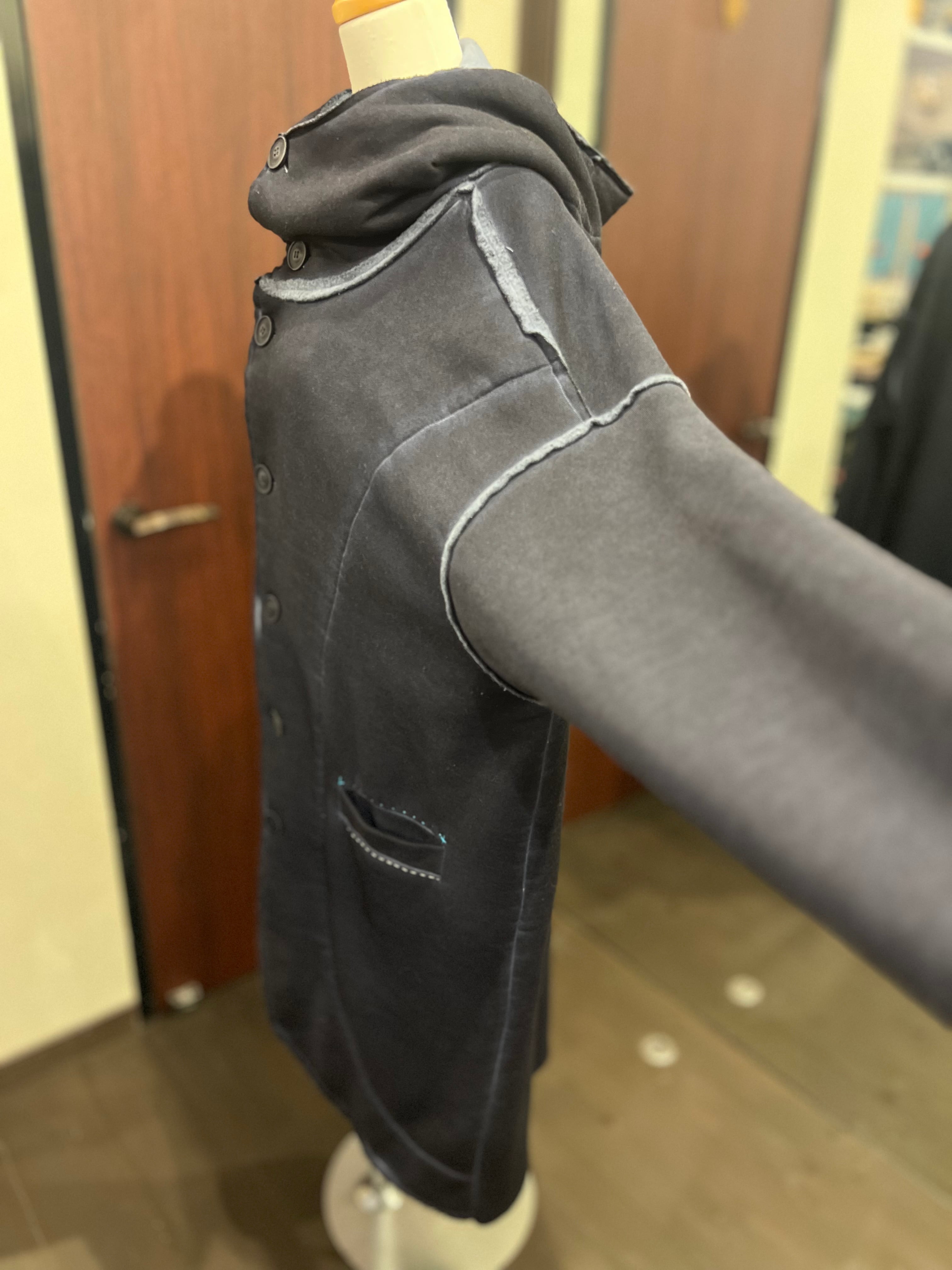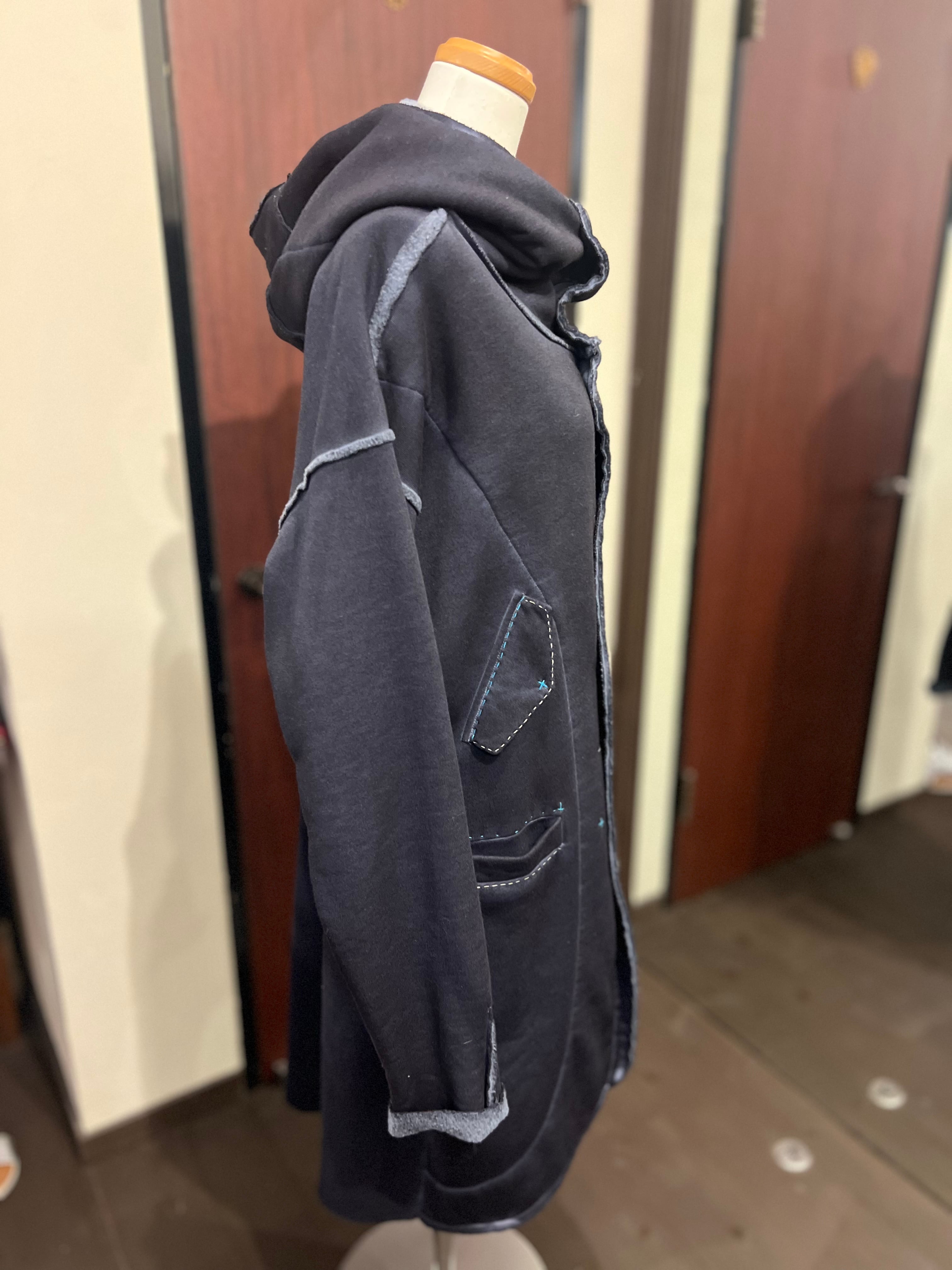 スモーキーな後染の色合いや計算されたフェミニンでありつつもmodeな素敵なコートです。かなりSize感もゆったりしておりメンズでも対応可能。ふわふわの裏毛が暖かく首元のデザイン次第でシルエットがいろいろ楽しめます。「重たいコートは苦手」「デザインで遊びたい!」という方にはぜひ着ていただきたい作品です。気持ち良い着心地はずっと着ていたくなります!こちらはブルーベース。アッシュグレー色も出品しております。