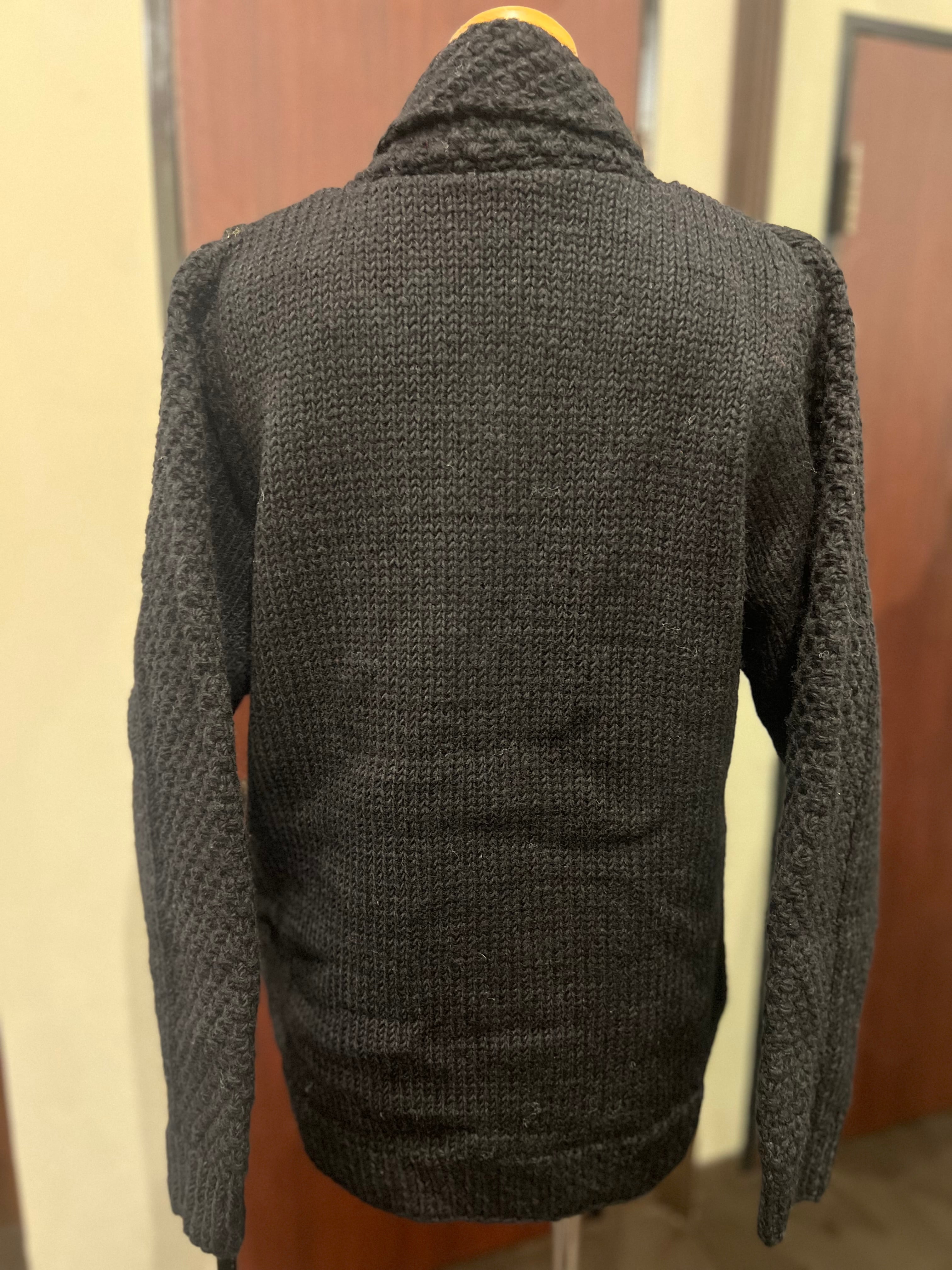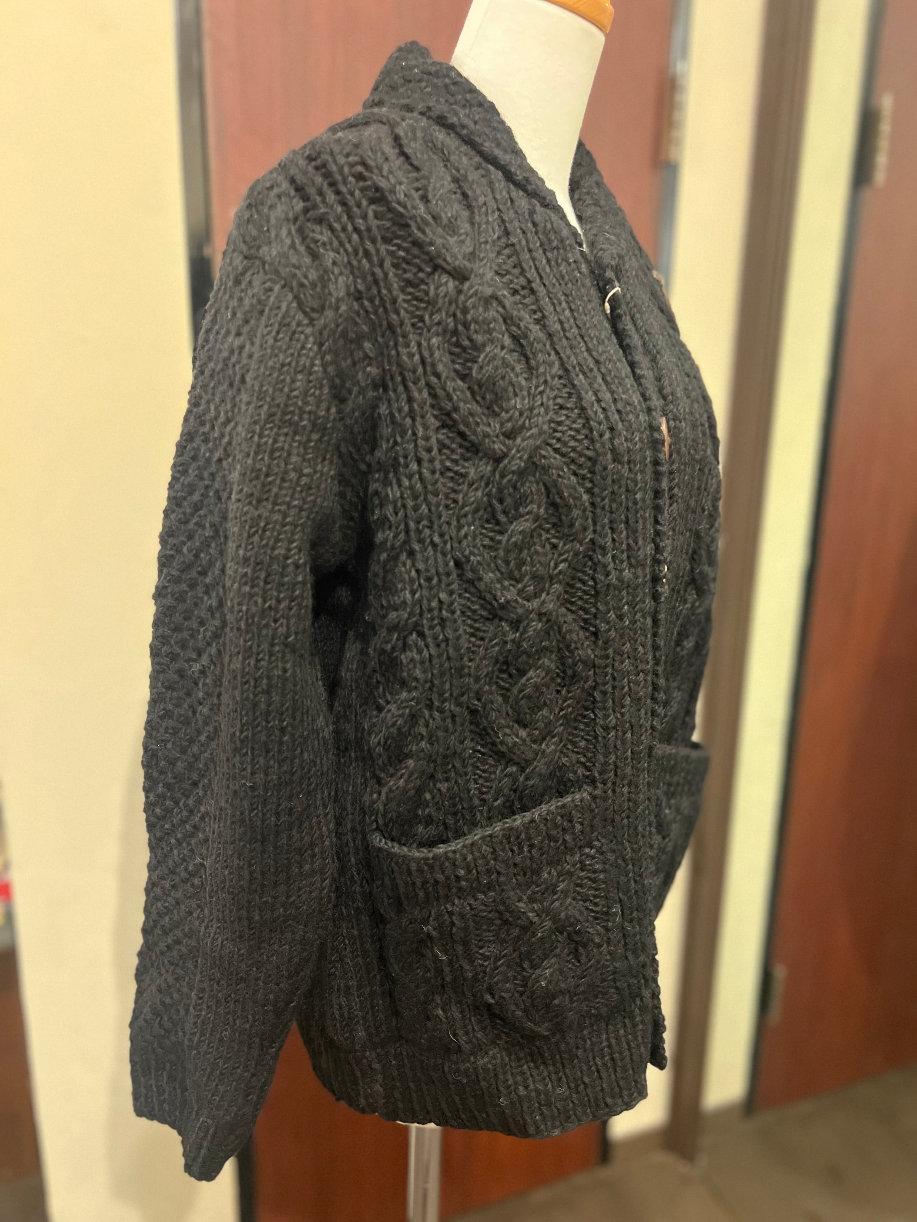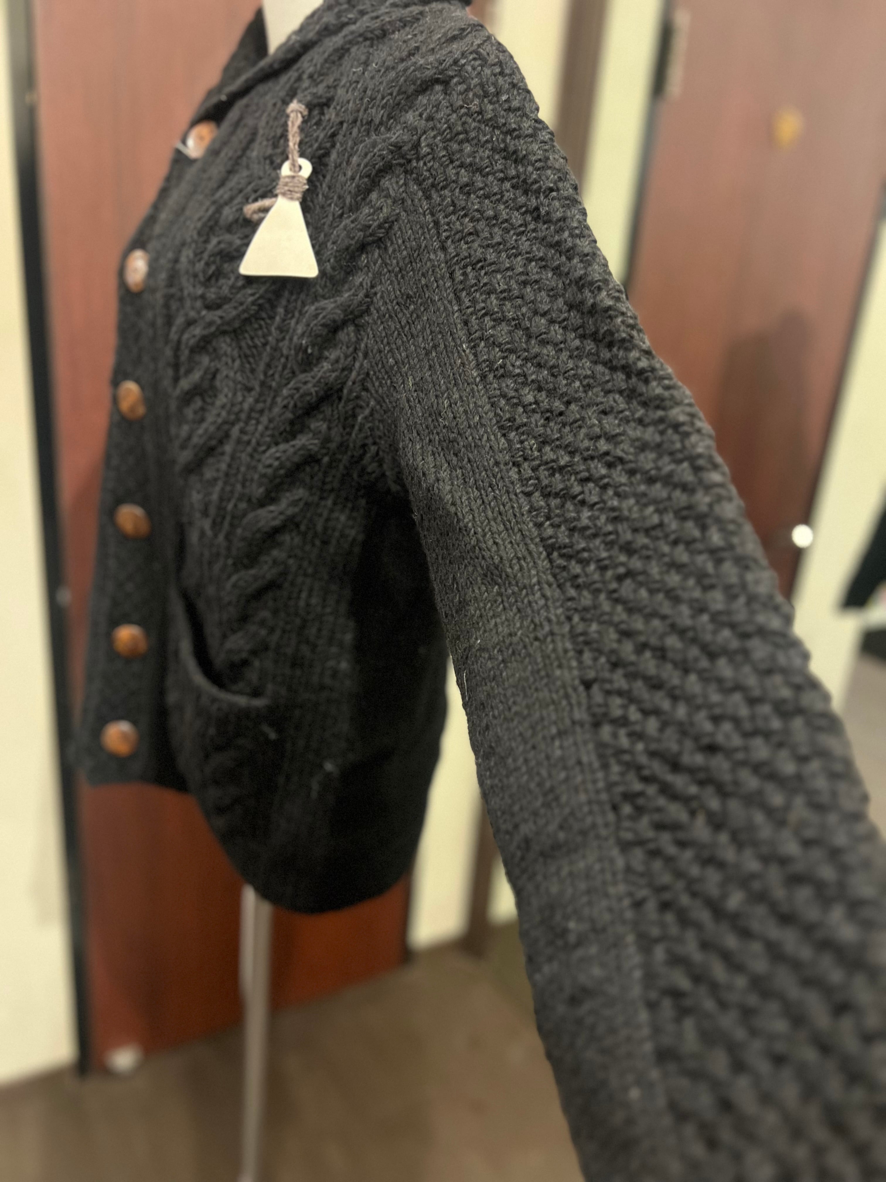 ナチュラルな丸襟がついた定番のカーディガン型。裏地がついているので風よけにも。袖上部、前身頃に遊び心のある編み模様が入っています。