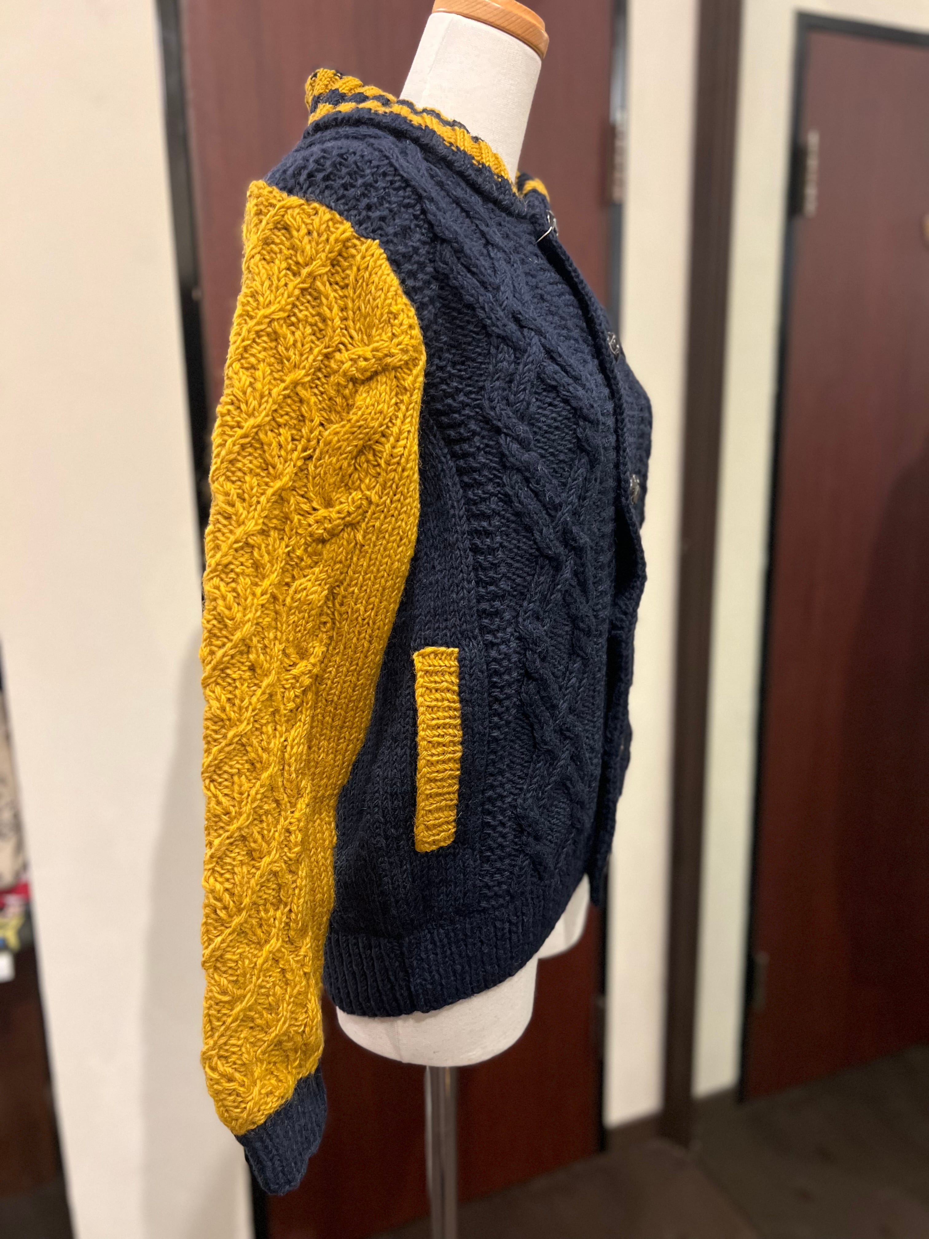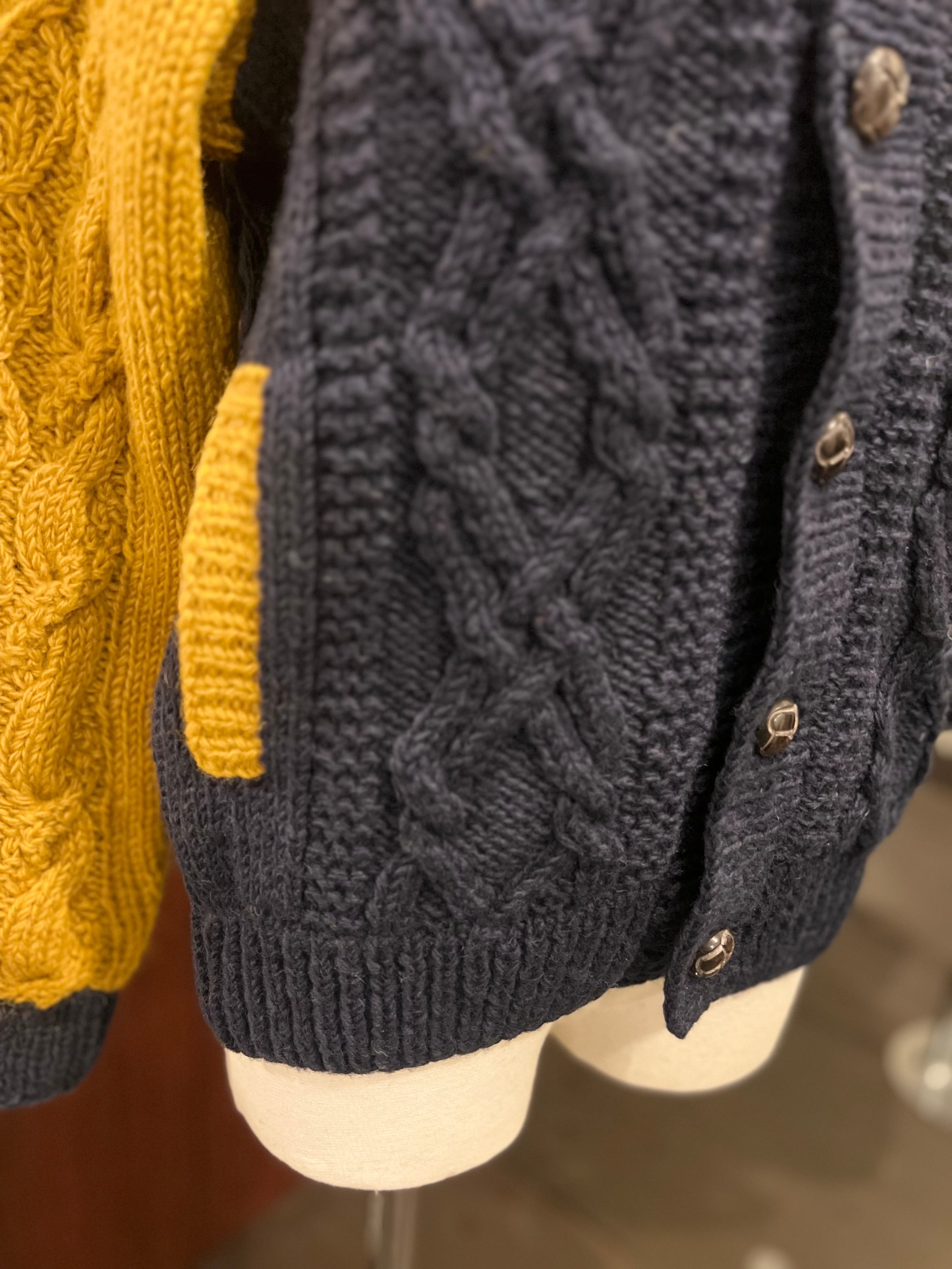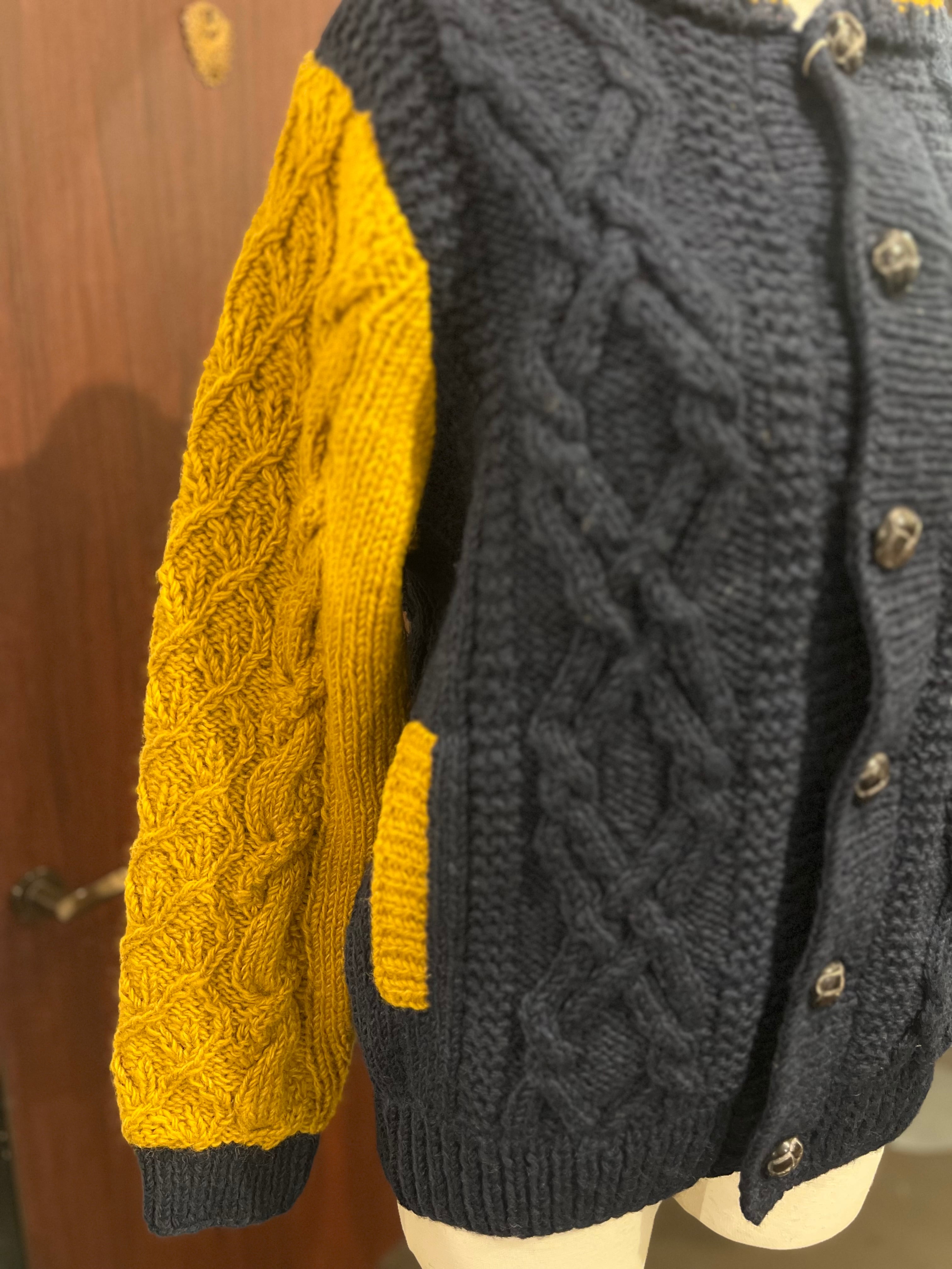 カラシ色×ネイビーのレトロな配色がとても可愛いニットカーディガン。裏地がついており風よけにもなります。イギリスの編みにはなかなかない珍しい総編みがとても素敵です。