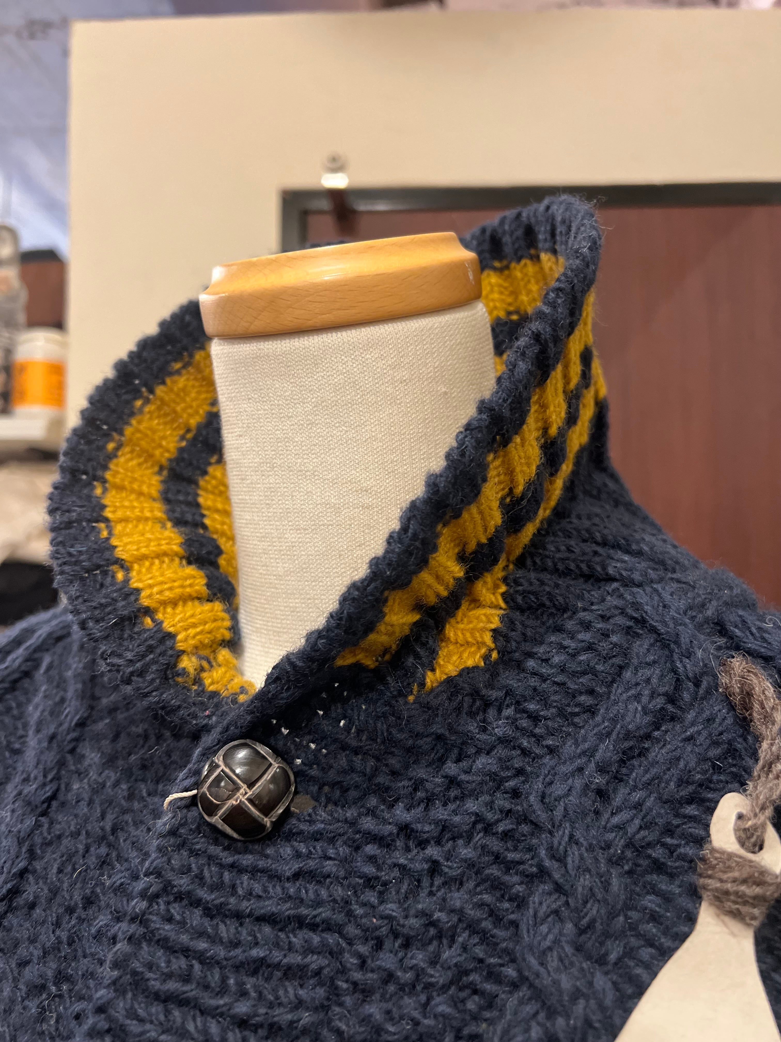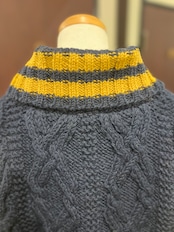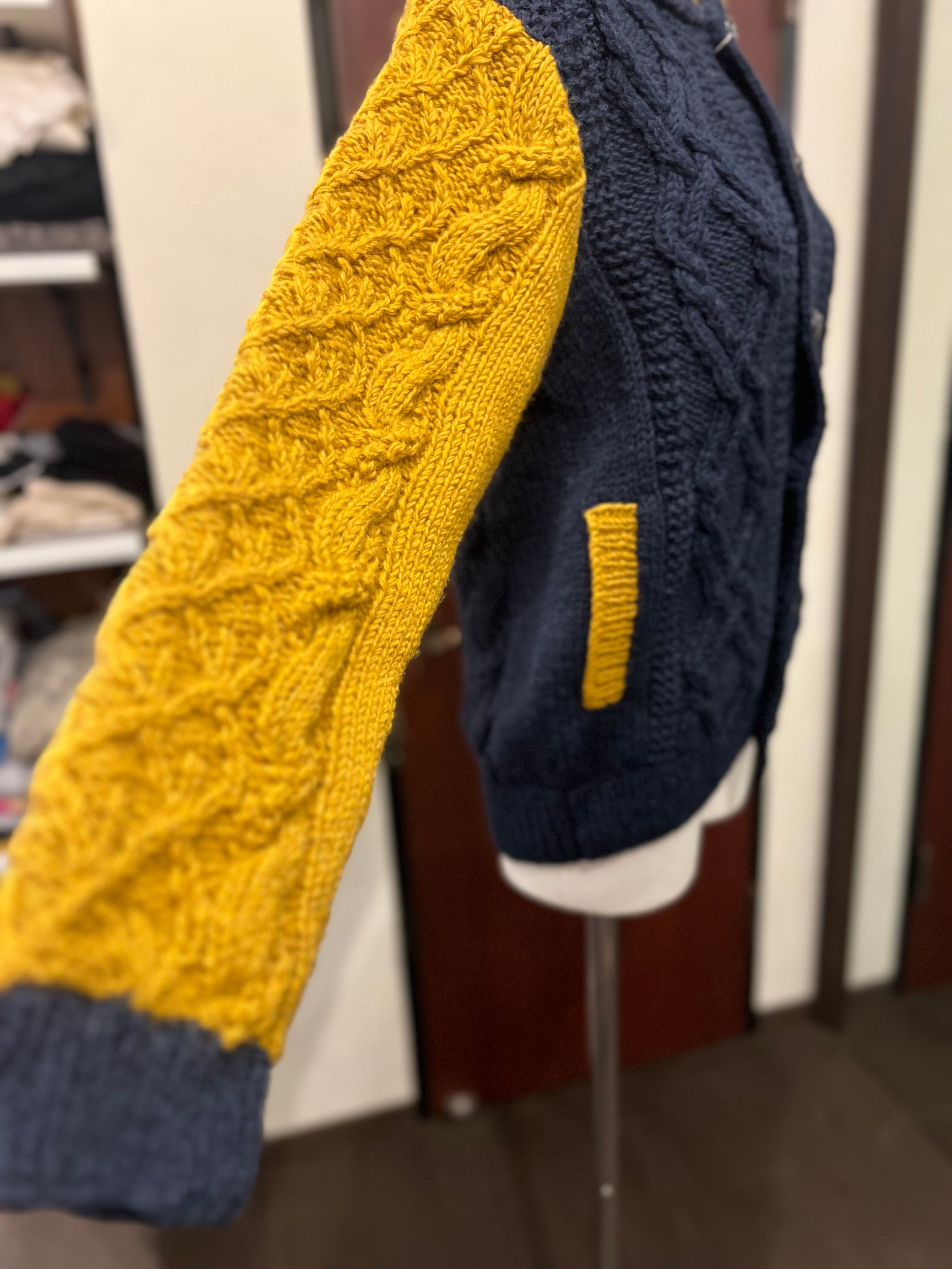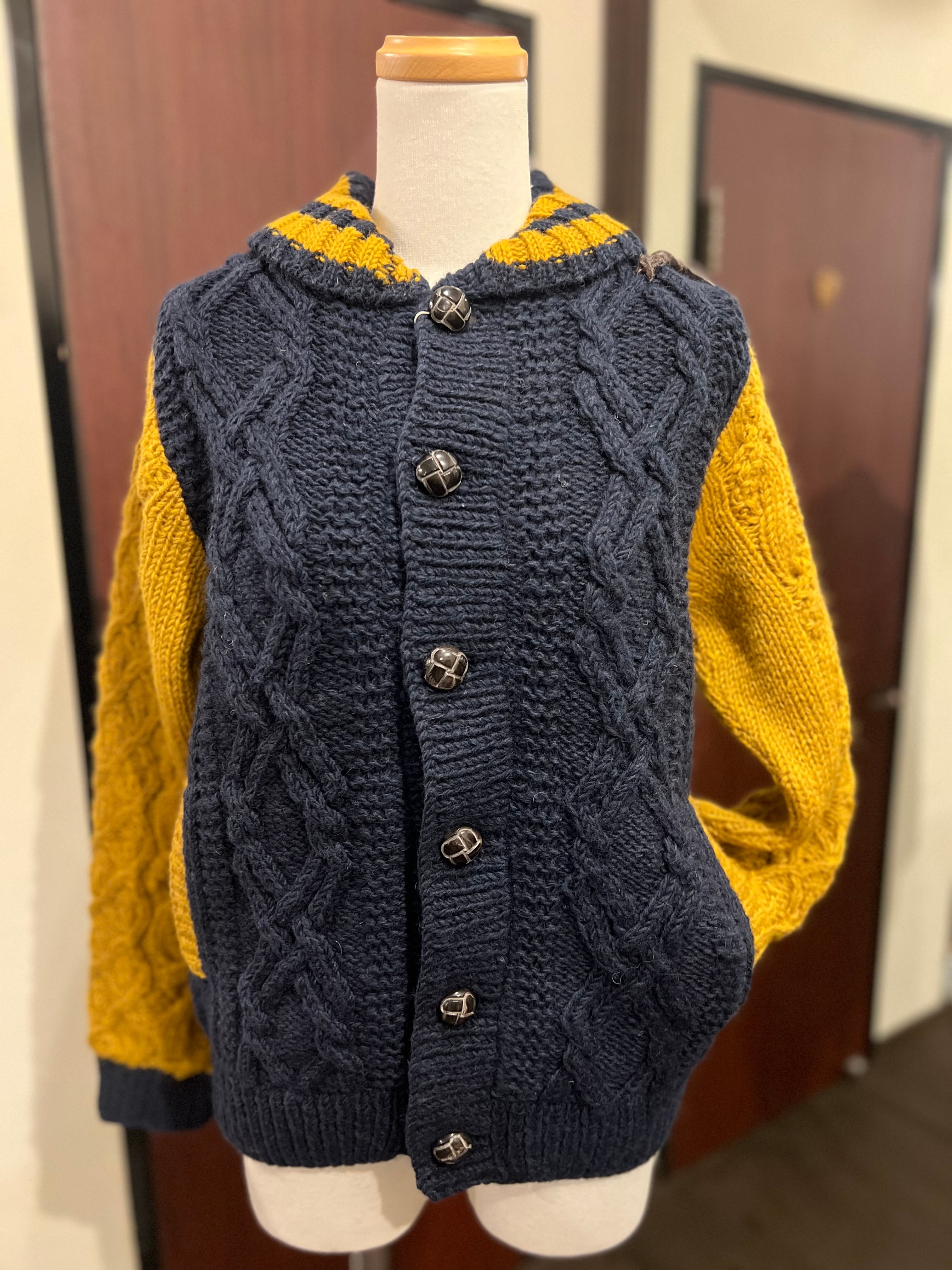 カラシ色×ネイビーのレトロな配色がとても可愛いニットカーディガン。裏地がついており風よけにもなります。イギリスの編みにはなかなかない珍しい総編みがとても素敵です。