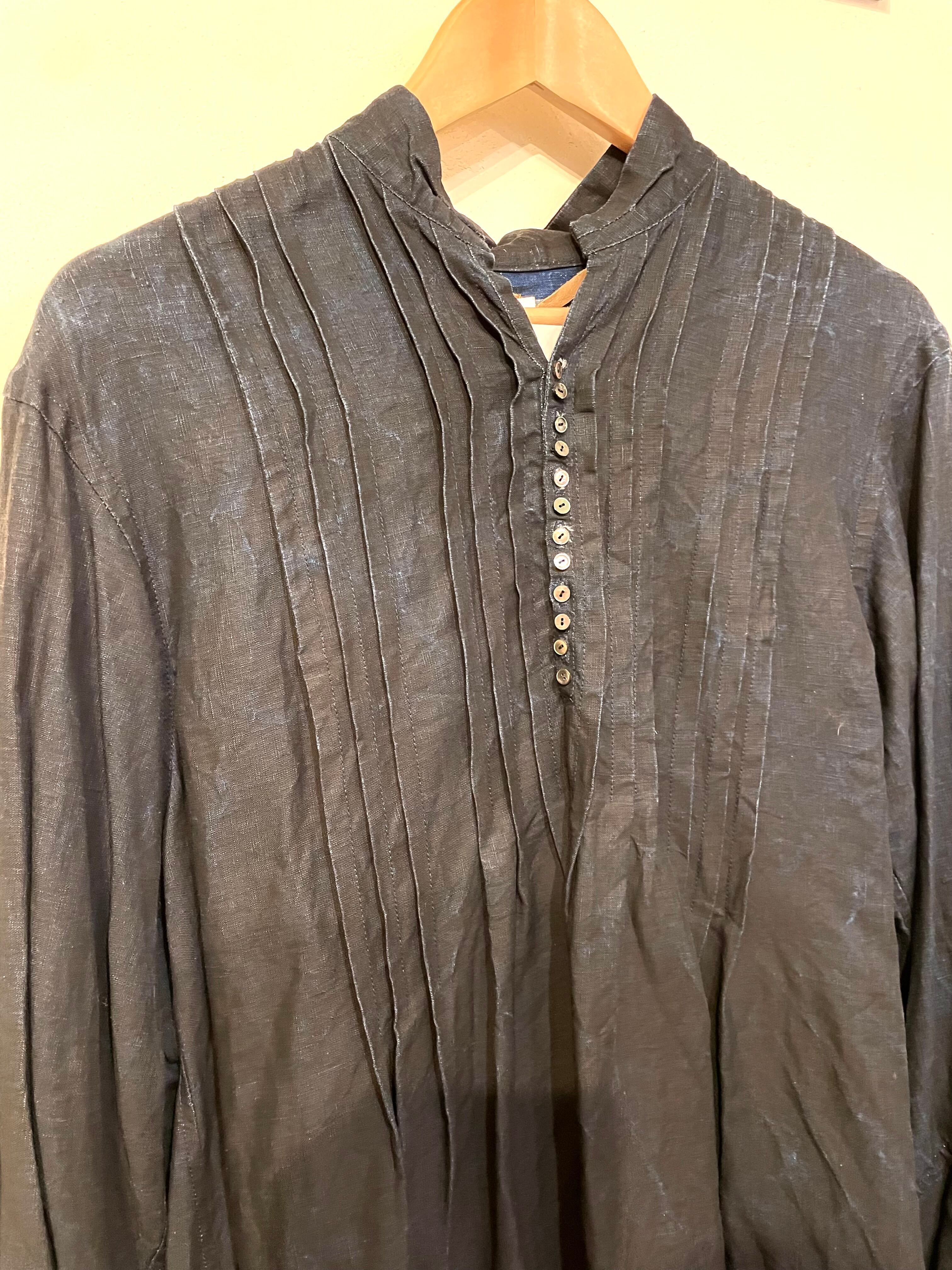 本製品はリネン素材の上より墨染めとインディゴ染めが施されています。