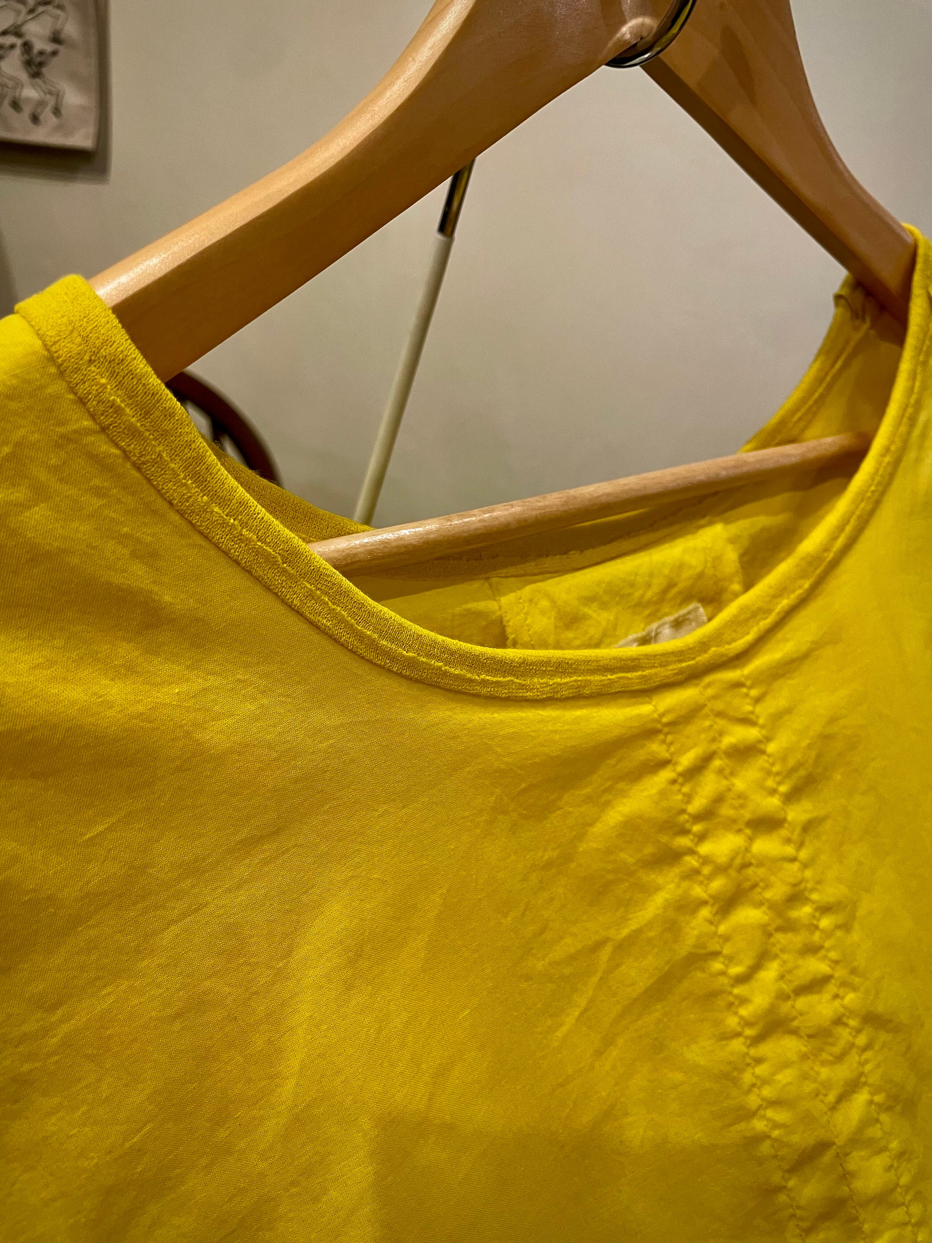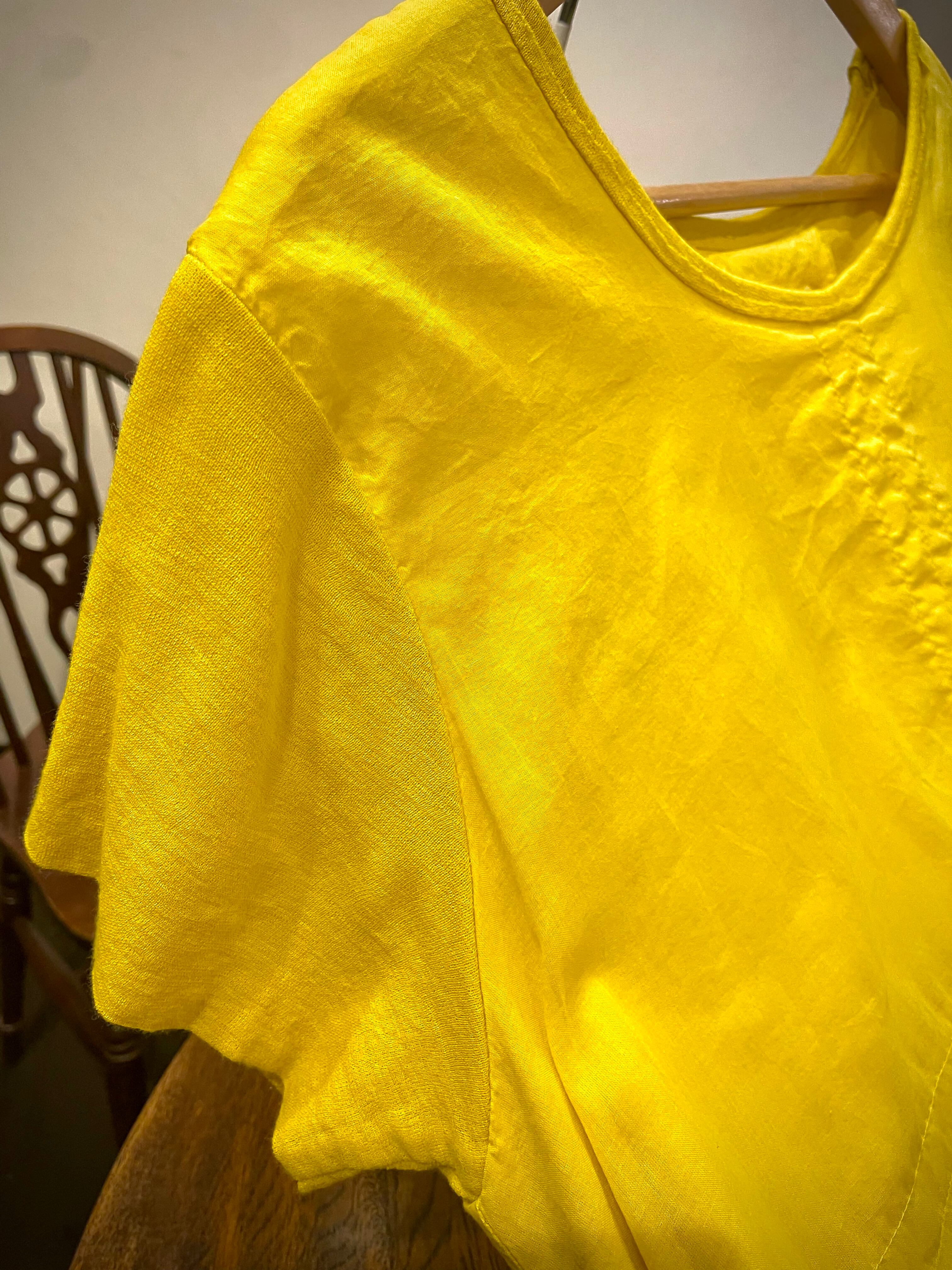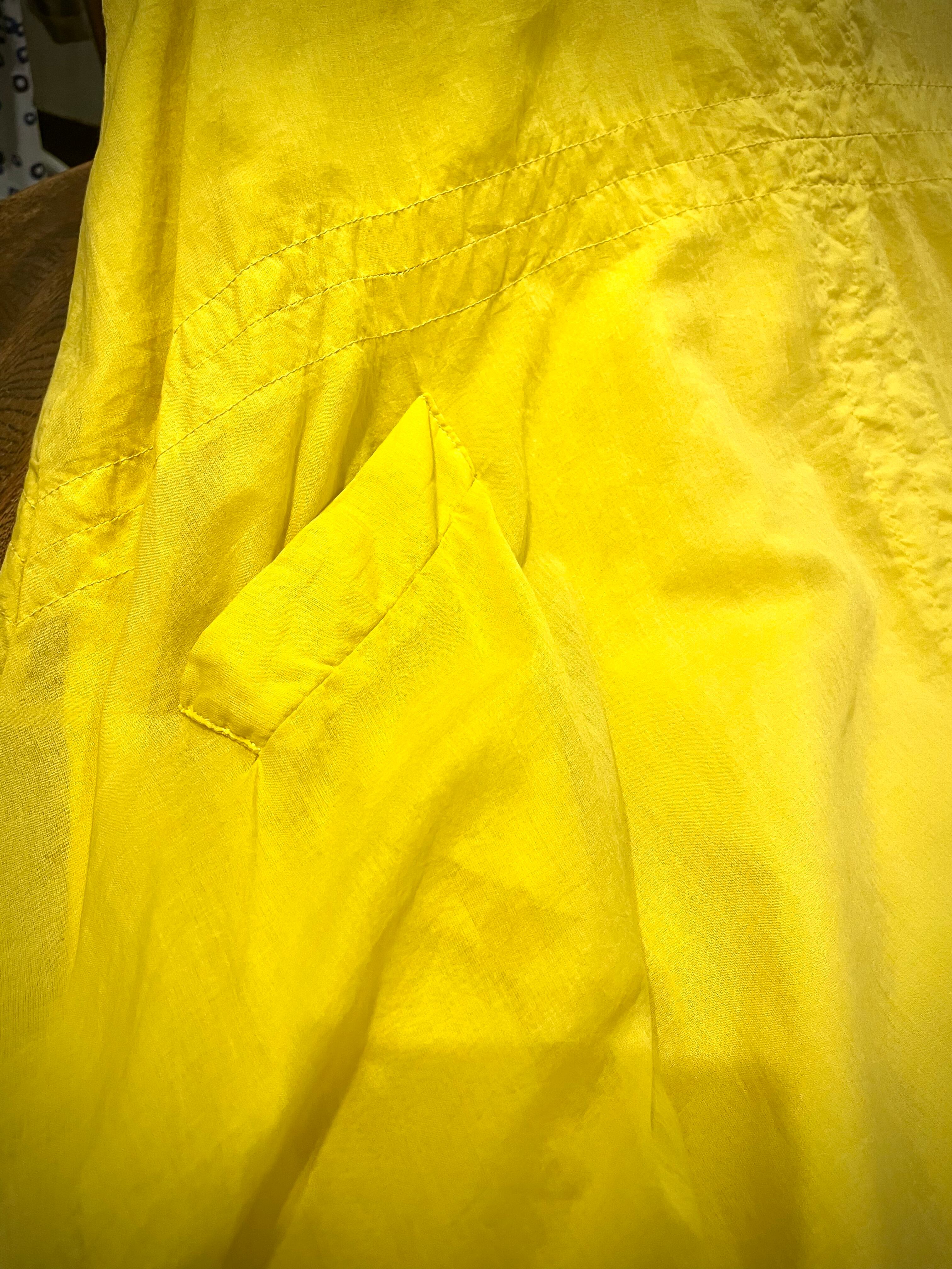 裏地もコットンで、透け感はありません。首元は同色のリネンで切り替えており首元や袖はリブ切り替え。柔らかく伸びの良い軽やかなフィット感です。カットオフデザインの裾も遊び心が楽しいです。サイドにデザインポケットあり。